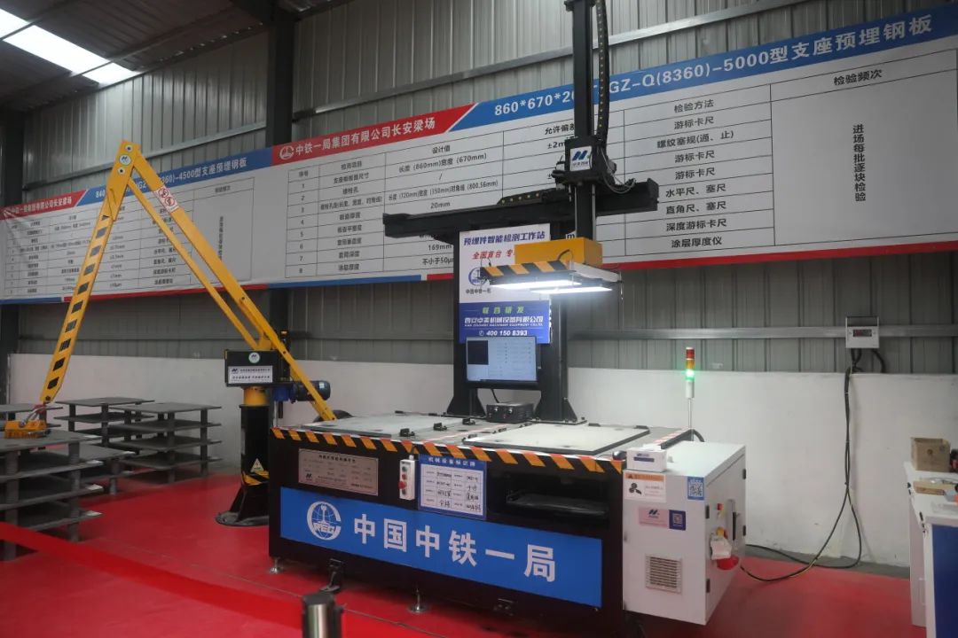 该平台主要由平整度检测系统、孔距检测系统、涂层测厚仪和助力机械臂等部分组成,通过专业仪器扫描等方式自动检测支座板等预埋件的螺栓孔间距、垂直度及涂层厚度等参数。