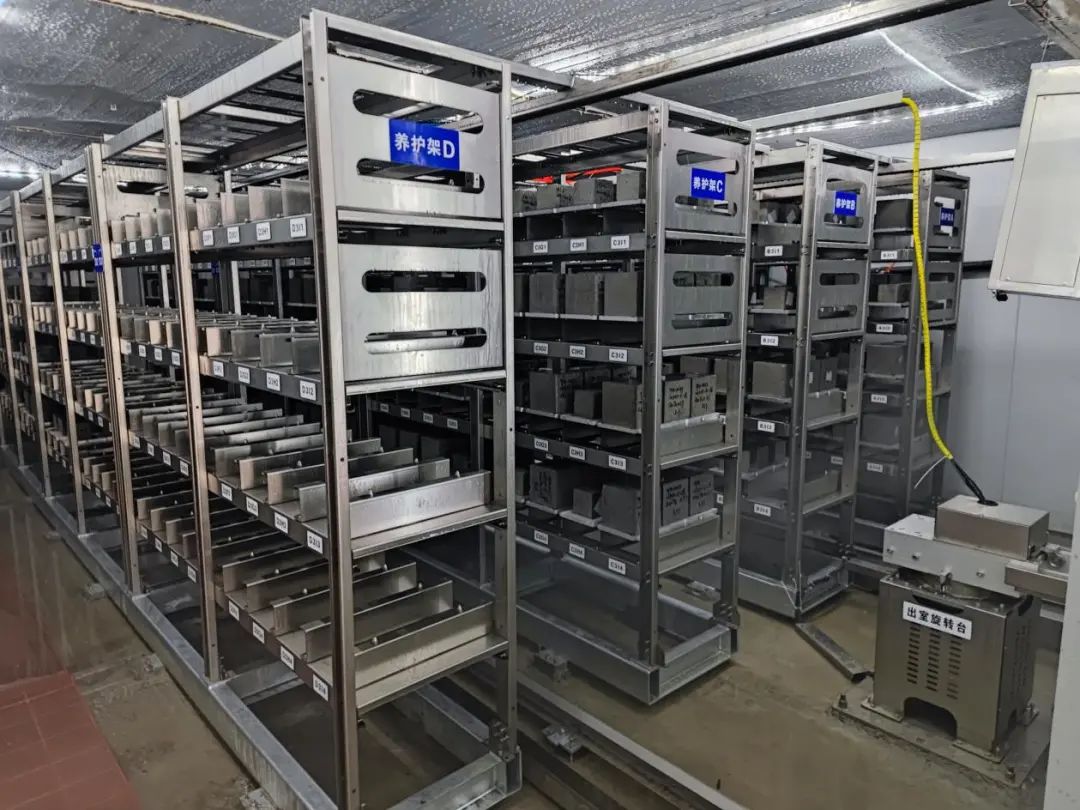 该系统主要由入库模块、养护架、堆垛机器人、养护模块、出库模块等部分组成。对接智能混凝土抗压强度检测系统后可完成对混凝土试样的入库养护、到期出库、自动上料、压缩试验、结果判定、 出料等试验过程全部由设备自动完成,排除人为干预,确保了试验数据的科学性和准确性,可不间断持续工作, 提高了工作效率。避免试验人员频繁进出养护室对养护室内温湿度的影响,避免试块因频繁转运造成的缺棱掉角的情况,防止因人为失误导致的试块存取差错,降低了试验人员的劳动强度,实现了试验机系统的自动化与智能化。