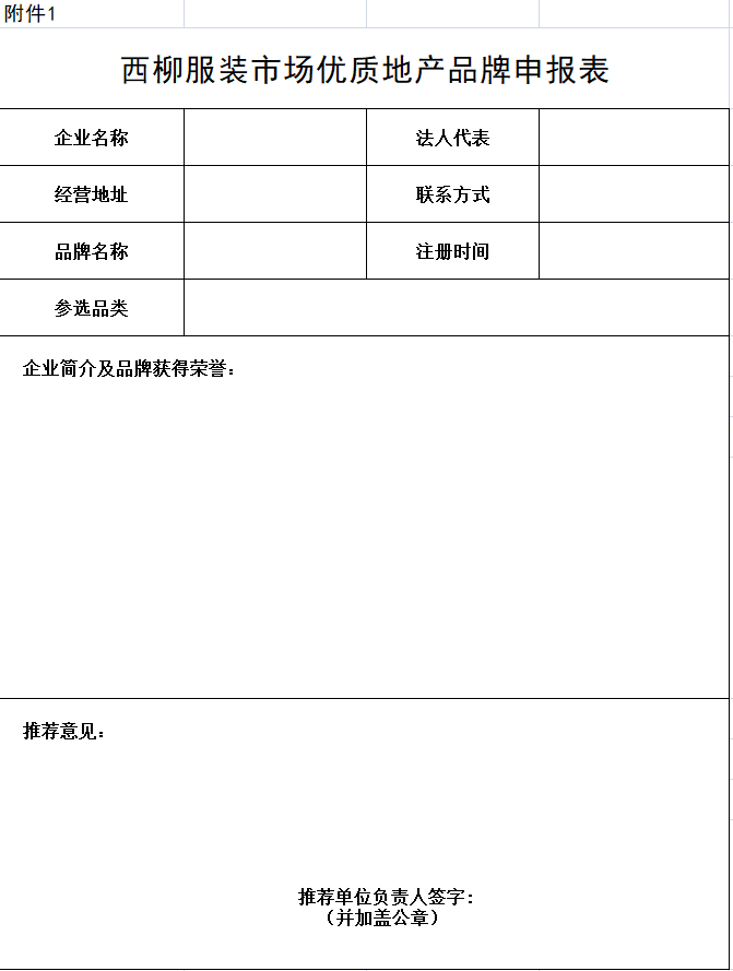 为进一步贯彻落实党中央、省、市关于实现纺织服装产业高质量发展的决策部署,打造以裤装、棉服、时尚女装、大码女装为龙头的西柳北派服饰区域品牌,全面提升西柳服装市场集群生命力、竞争力和影响力,按照海城市委、市政府关于推动西柳服装市场高质量发展工作部署,根据海城市人民政府相关会议决定(2023年8月27日),我市拟开展评选西柳服装市场优质地产品牌活动,具体情况公告如下:坚持以习近平新时代中国特色社会主义思想为指导,全面贯彻落实党的二十大精神,牢固树立创新、协调、绿色、开放、共享的新发展理念,以推动西柳市场服装产业高质量发展为目标,加快培育一批具有较高知名度、美誉度和较强市场竞争力的西柳北派服饰区域品牌,激发市场主体活力和内生动力,推进集群向商品品牌化、商城智能化、业态多元化、贸易国际化提质升级。评选活动坚持公平、公正、公开的原则,采取企业自主报名申请、行业协会推荐、领导小组集中讨论的方式进行,强调公众的参与度、评选过程的透明度与评选结果的公信力。在西柳服装市场集群内,诚信经营的、运营情况良好的、具备发展潜力的和注册自主品牌的中小型本土服装企业;申报品牌的企业需具备完整的品牌理念、品牌文化、品牌标识。评选棉服品牌10强、裤装品牌10强、女装品牌10强和外贸服装行业发展“突出贡献奖”1家。1、坚决贯彻执行海城市委、市政府制定的有关市场及纺织服装企业发展的路线、方针、政策,全力支持和积极参与上级组织的有关市场及纺织服装产业发展的相关活动,在行业中具有较强的影响力,群众威信较高,具有大局意识,是行业中的领军人物,具有较强的社会责任感,积极参加社会公益活动;2、申报单位须为市场监督管理局正规注册的企业和个体工商户;5、申报品牌注册地须在中国境内,品牌商标须为国家知识产权局注册的合法商标;6、具备较强的品牌成长潜力,过去三年销售额平稳增长,未来三年有持续、稳定发展能力;7、申报品牌须为中国纺织工业联合会认定的“中国服装成长型品牌”;8、申报品牌未被列入经营异常名录或严重失信主体名单,生产产品不属于国家禁止、限制或淘汰类,同时近三年未发生重大安全(含网络安全、数据安全)、质量、环境污染等事故以及偷漏税等违法违规行为。1、媒体公告。通过相关媒体介绍西柳服装市场优质地产品牌评选活动的目的意义、扶持政策和措施。公布评选范围、评选标准、评选办法和进入公示阶段的企业品牌名单。2、申请报名。相关服装企业向西柳服装市场优质地产品牌评选领导小组办公室提出申请,并填写《西柳服装市场优质地产品牌申报表》(附件1)。报名材料:500字简介(企业规模、主要业绩、产品特色、经营场所、所获荣誉等)。3、资格审查。西柳服装市场优质地产品牌评选活动领导小组办公室对上报单位进行资格审查,确定申报企业品牌是否进入评审阶段。4、初审推荐。西柳服装市场优质地产品牌评选活动领导小组初审推荐组进行品牌资格初审,从入围企业品牌中选出优质地产品牌,向领导小组进行推荐 。5、确定名单。由评选工作领导小组召开工作会议,集体研究讨论,确定棉服、裤装、女装等30强和外贸服装行业发展“突出贡献奖”1家。评选结果以《西柳服装市场优质地产品牌审核意见表》(附件2)的形式,由领导小组向市委、市政府呈报,确定最终名单。对获得西柳服装市场棉服品牌10强、裤装品牌10强、女装品牌10强、外贸服装行业发展“突出贡献奖”的企业,将享受扶持政策如下:1、优先享受省、市、镇支持企业发展的优惠扶持政策。2、在参与西柳国际服装周、境内外大型展会以及西柳纺织服装品牌各类推介活动中,市、镇两级政府给予免费宣传推介。