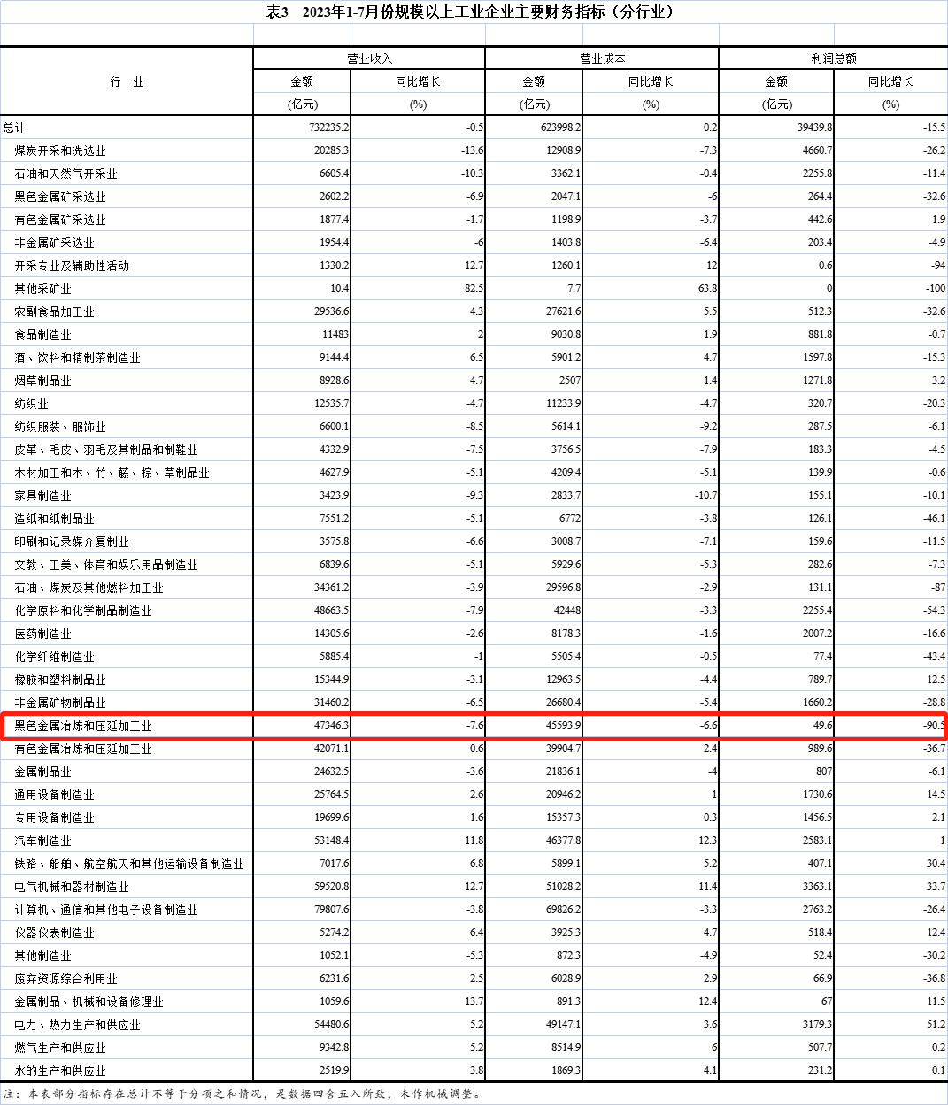 1-7月份,在41个工业大类行业中,13个行业利润总额同比增长,28个行业下降。主要行业利润情况如下:电力、热力生产和供应业利润总额同比增长51.2%,电气机械和器材制造业增长33.7%,通用设备制造业增长14.5%,专用设备制造业增长2.1%,汽车制造业增长1.0%,石油和天然气开采业下降11.4%,纺织业下降20.3%,煤炭开采和洗选业下降26.2%,计算机、通信和其他电子设备制造业下降26.4%,非金属矿物制品业下降28.8%,农副食品加工业下降32.6%,有色金属冶炼和压延加工业下降36.7%,化学原料和化学制品制造业下降54.3%,石油、煤炭及其他燃料加工业下降87.0%,黑色金属冶炼和压延加工业下降90.5%。