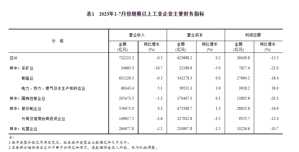 1-7月份,全国规模以上工业企业实现利润总额39439.8亿元,同比下降15.5%,降幅比1-6月份收窄1.3个百分点。