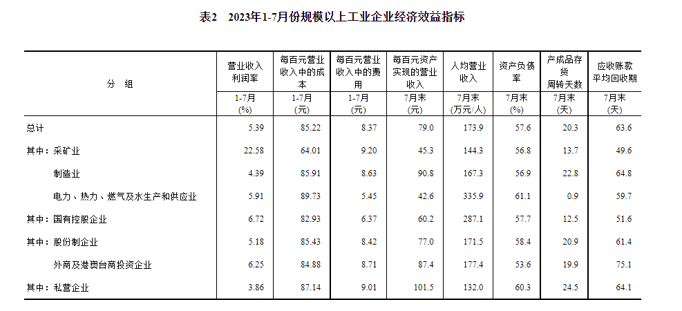 7月末,规模以上工业企业每百元资产实现的营业收入为79.0元,同比减少6.2元;人均营业收入为173.9万元,同比增加4.9万元;产成品存货周转天数为20.3天,同比增加1.1天;应收账款平均回收期为63.6天,同比增加6.3天。