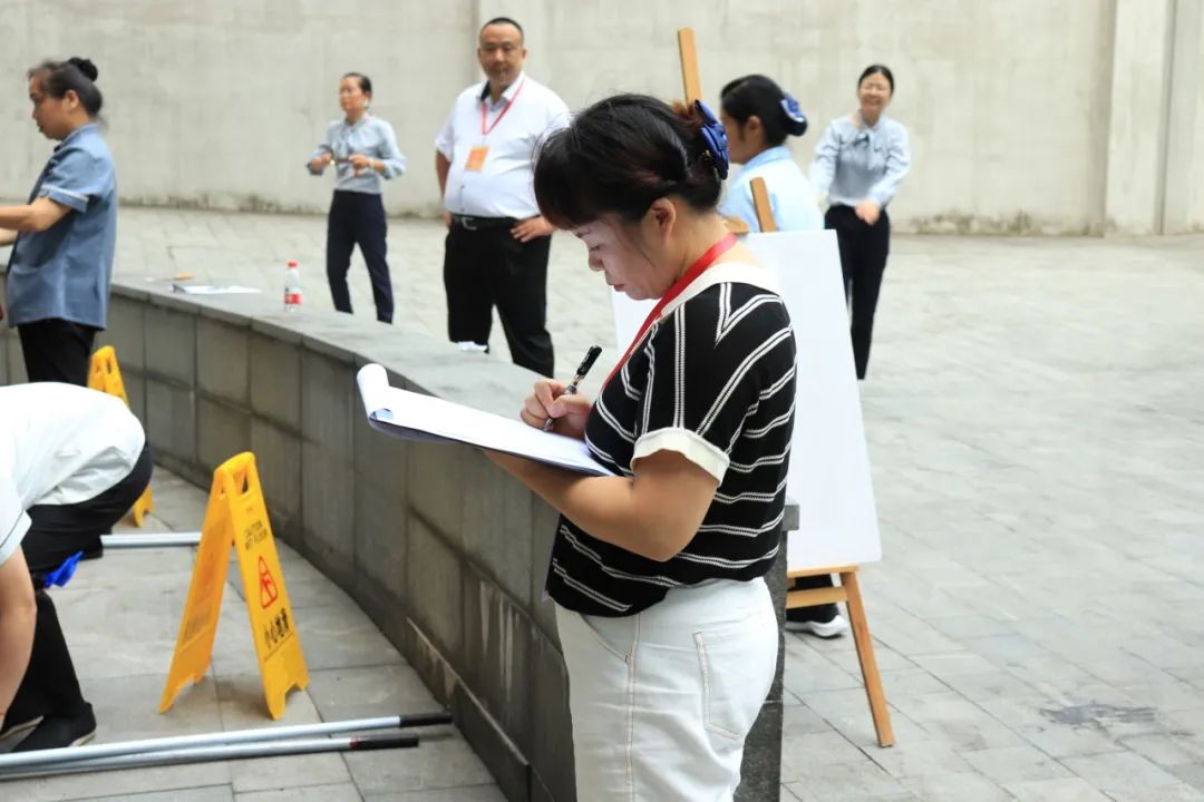 实操项目分为玻璃擦拭及地面清洁两大模块进行,参赛选手们通过抽签选择自己参赛项目。参赛选手带着拖把、水桶、玻璃刮、抹布、铲刀等保洁工具在评委的带领下到达各自抽到的位置准备比武,待评委一声“开始”,每位参赛队员并驱争先,各自运用熟练的操作技巧在规定的比赛时间内完成了整个标准的操作流程。比赛过程中来不及擦拭汗水的她们,在兼顾速度的同时却细致耐心地将各个角落清理的干干净净,用实力和专业诠释了品质服务的精彩!