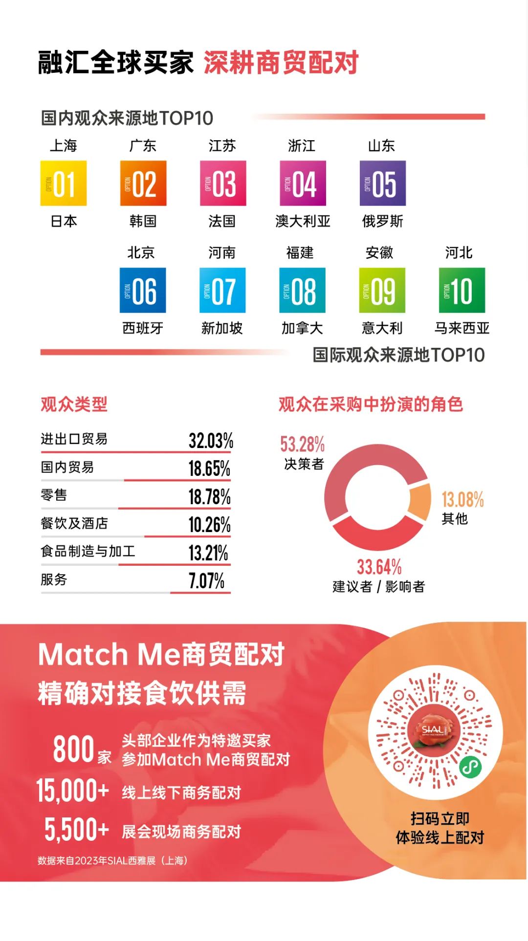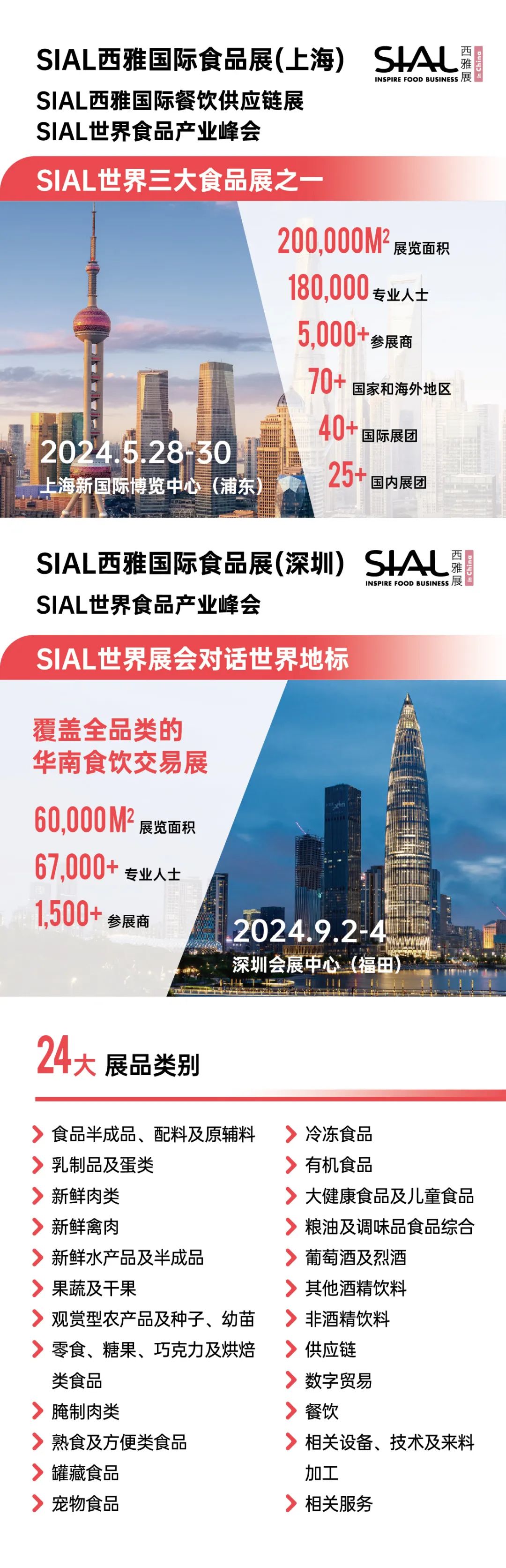 2024年5月28-30日,SIAL世界三大食品展之一的SIAL西雅展(上海)将于上海新国际博览中心(浦东)举办;2024年9月2-4日,SIAL西雅展(深圳)将于深圳会展中心(福田)举办。双展规模体量将再次全面超越往届,未来无限,敬请期待。