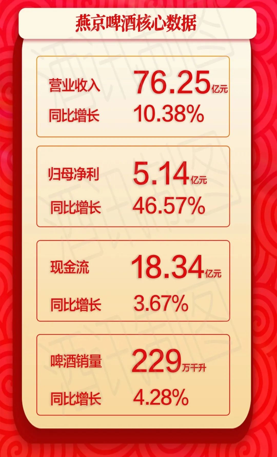 据燕京最新财报显示,公司营业收入 76.2亿元,同比增长10.38%,实现归属于上市公司股东的净利润 5.1亿元,同比增长46.57%。