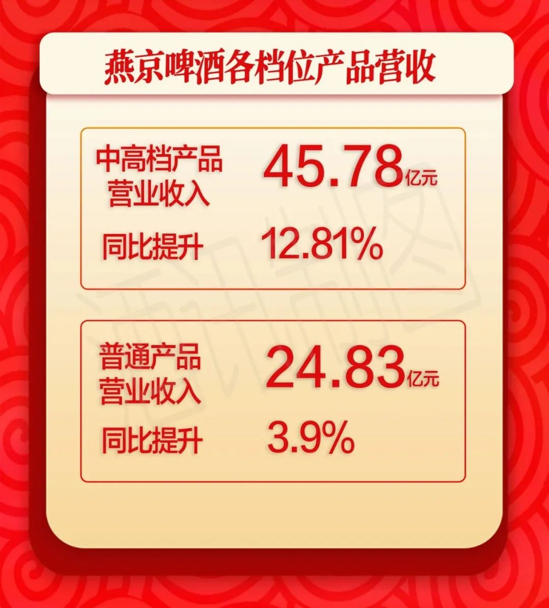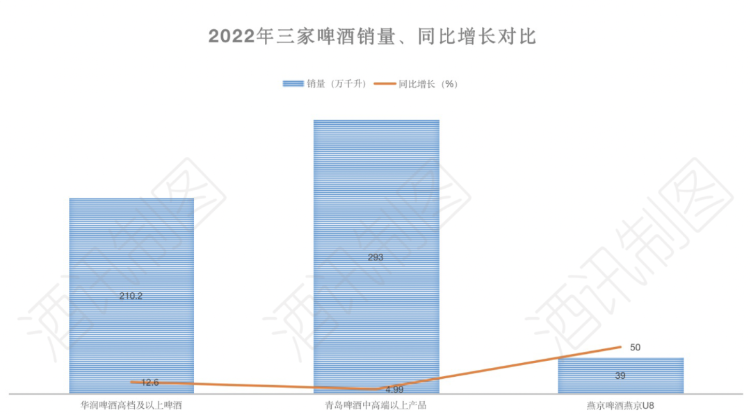 根据公开数据显示,2022年华润啤酒高档及以上啤酒销量约210.2万千升,同比增长12.6%;青岛啤酒中高端以上产品实现销量293万千升,约占全年总销量36%,中高端以上产品销量同比增长4.99%;燕京啤酒燕京U8销量达39万千升,同比增长超50%。