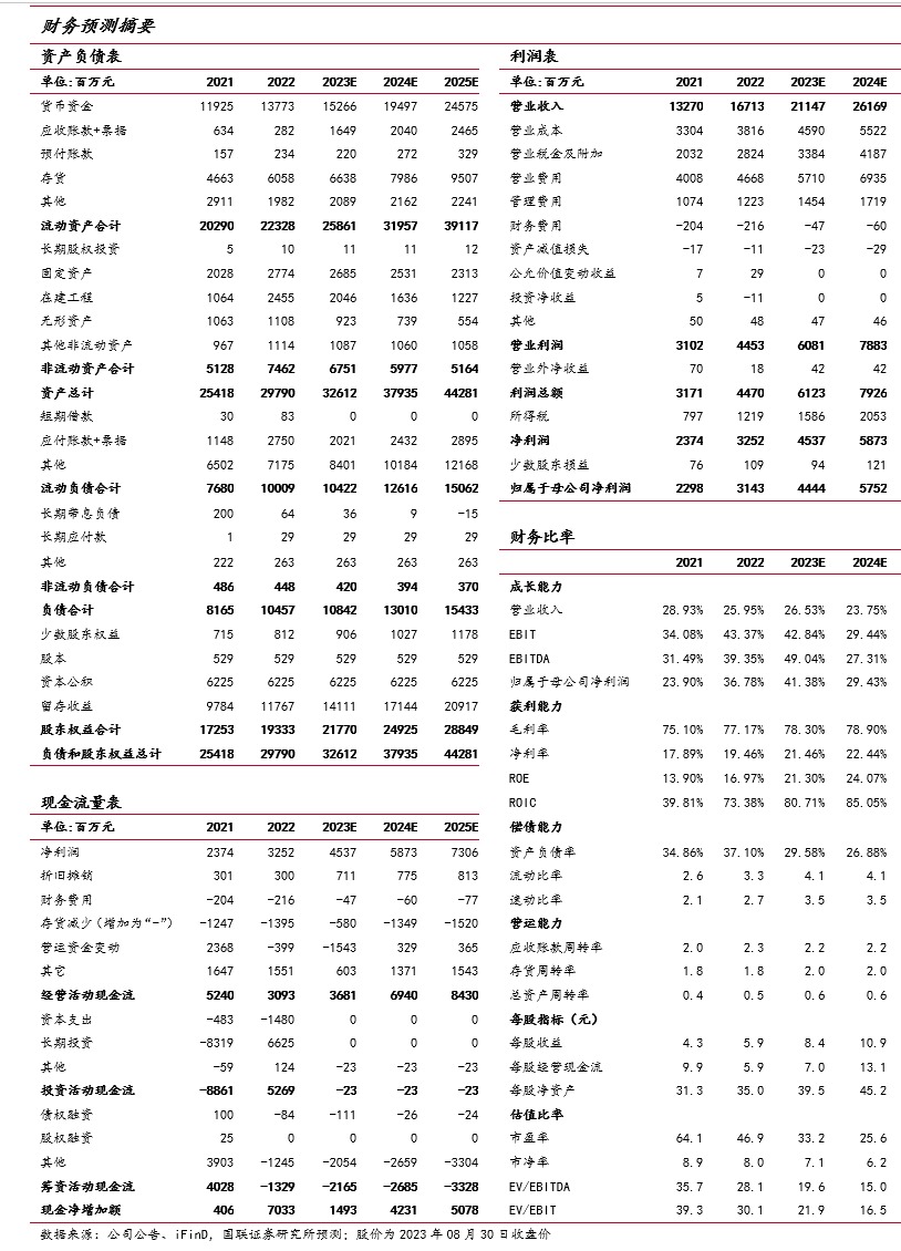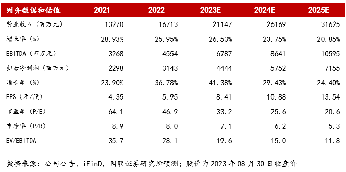 我们预计公司2023-25年收入分别为211.47/261.69/316.25亿元,对应增速分别为26.5%/23.7%/20.8%,净利润分别为44.44/57.52/71.55亿元,对应增速41.4%/29.4%/24.4%,EPS分别为8.41/10.88/13.54元,对应PE分别为33/26/21。参照绝对与相对估值,我们给予公司24年31倍PE,目标价340.54元,维持“买入”评级。