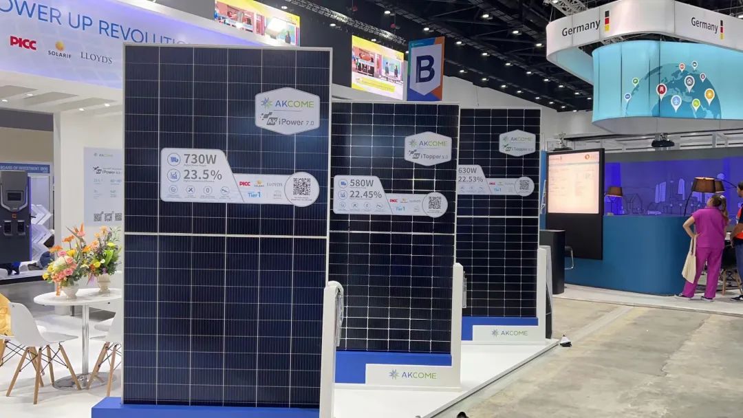 近年来,爱康持续深耕海外市场,泰国作为爱康进军东南亚的主线市场之一,针对泰国本土国情及装机条件,特推出一系列可满足于泰国应用场景的系列组件。此次爱康重磅展出AK iPower系列(HJT)组件730W和AK iTopper系列(TOPCon)组件440W、580W和630W,展品一经展出,便吸引了众多观众的目光,展会现场氛围一度火爆。