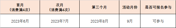 4、抽签当月2023年9月份向前推算3个月内,于2023年6月、2023年7月连续2个自然月,每个月在夏商集团零售终端全渠道(厦门夏商百货、三明夏商百货、龙岩夏商百货、南平夏商百货、厦门夏商民兴超市、厦门夏商酒业、厦门夏商多点)消费次数达到4次(含)以上(消费次数按照单终端计算,一天内多次消费的,仅计算1次消费次数,退货或已经取消的订单不计入消费次数);