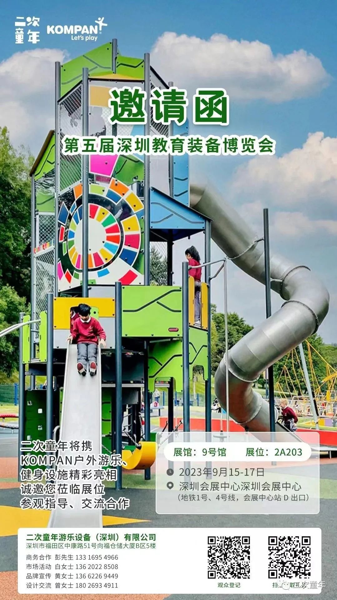 二次童年游乐设备(深圳)有限公司是一家为中国教育、市政、文旅、地产等行业客户提供无动力游乐场、健身场地解决方案的专业服务商,从成立之初,就依托全球游乐和健身设施领导品牌丹麦康攀KOMPAN强大的研发、设计和生产实力,整合国内优质资源,包括行业设计专家、教育学者、心理学专业顾问,旨在为全年龄段的人创造更欢乐、更健康的社区氛围。