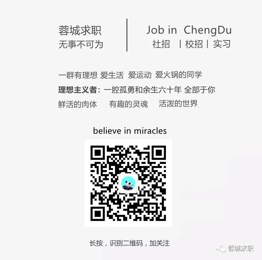 蓉城求职(Job In ChengDU)成立于2020年3月,是川渝地区最老牌的泛体制内中高端求职公众平台,以泛成渝地区社招、校招、实习为细分关注领域的垂直自媒体,是目前川渝地区粉丝学历层次最高毕业学校最好的求职公众号。近年来,公众号以独到的行业视角及客观的行业态度,对泛成渝就业市场及高薪岗位、市场变化、重点校招进行不聒噪的记录与分析,以"真实、客观、内敛"为核心要旨,不装逼不扯淡不浮夸的发布第三方视角观点,尽力提供泛成渝地区最新泛体制内行业真实的职位需求以谋求消除求职市场的。蓉城求职(Job In ChengDU)致力于社会公益行动,通过联合社会公益力量,每年向社会公益输出简历修改500+份以上,公益讲座10+场以上,公益咨询以及公益问答近万次。