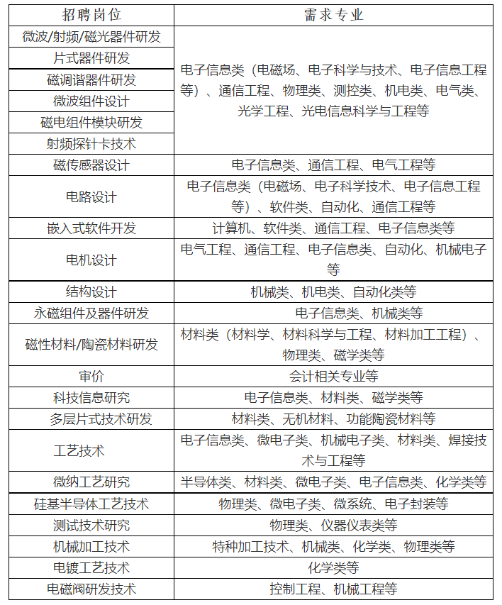 中建西南咨询顾问有限公司(简称:中建咨询),始于1980年,是央地战略合资的在川央企,隶属于中建集团中建西南建筑设计院,是全国首批全过程工程咨询试点企业。中建咨询围绕“让天下没有难做的工程”的企业愿景,致力于打造中国工程咨询第一品牌,业务覆盖工程咨询全产业链。中建咨询首创PTE+N的全过程工程咨询产品体系,探索“双碳+”,数字咨询等跨领域咨询产品,完成了一批国内外具有重大影响力的重点工程、地标工程,如:成都天府国际机场、青岛胶东机场、广州白云机场、成都金融中心双子塔、青岛院士港、香港科技大学等工程咨询项目。中建咨询立志于完善新咨询行业标准,探索全咨人才的培养标准与培养体系,助推行业转型发展。应往届理工科类博士,双碳、暖通、绿色建筑、节能建筑等相关研究方向优先。工程管理、工程造价、结构类、电气、给排水、市政工程等相关专业。工程管理、建筑类、结构类、暖通、电气、给排水、市政道路、市政桥梁等相关专业。计算机科学与技术、计算机应用、软件工程、网络工程等相关专业。计算机科学与技术、计算机应用、软件工程、网络工程等相关专业。“3“:三年培养周期:教一年,管一年,综合转型再一年“N“:多重项目保障:多元化培养模式,全过程跟踪学习成果管理与专业双通道,技术+经营+管理灵活转换,职业发展不受限。共享中建集团、中建西南院、中建咨询三重培训资源,全职业生涯培养成长。六险二金:法定五险+补充医疗保险+住房公积金+企业年金特色福利:270°C全景办公区、文体社团、咖啡厅、图书吧、健身房、篮球场投递简历-中建集团统一考试-筛选简历-初试(宣讲会现场/线上)-复试-发放offer-签署三方协议https://recruit.cscec.com/recruit#/portal_job_list?job_class=campus&company_id=1873&contract_unit=32049909中国电子科技集团公司第九研究所,对外又称西南应用磁学研究所(SIAM),是我国唯一综合性应用磁学研究机构,是我国重要的高端关键磁性电子器件、组件、材料研制基地,位于四川省绵阳市,拥有四川省磁性材料工程技术研究中心、四川省先进磁性器件技术中心、四川省博士后创新实践基地、博士后科研工作站西磁分站、研究生联合培养基地等平台。中国电子元件行业协会磁性材料与器件分会副理事长单位