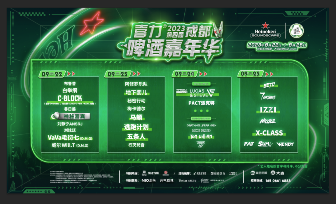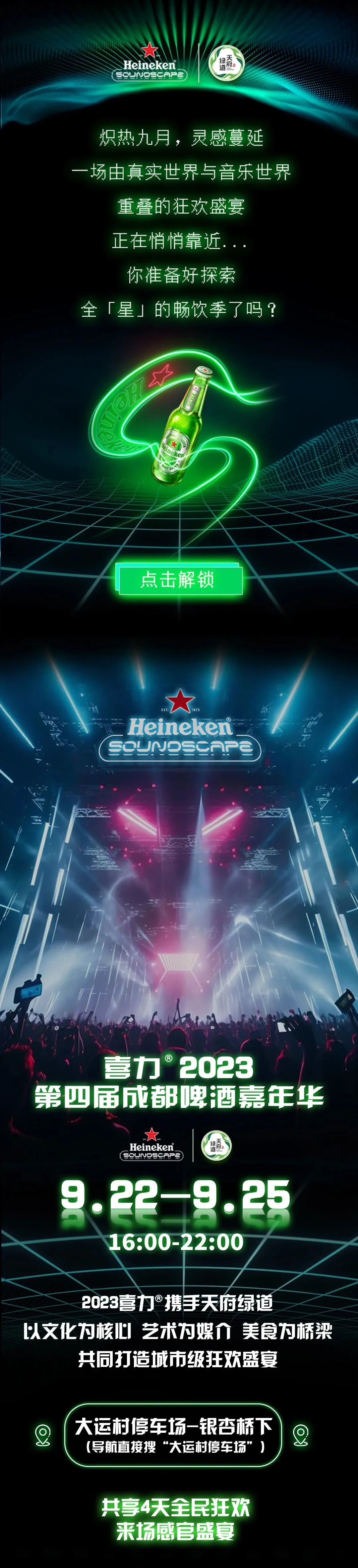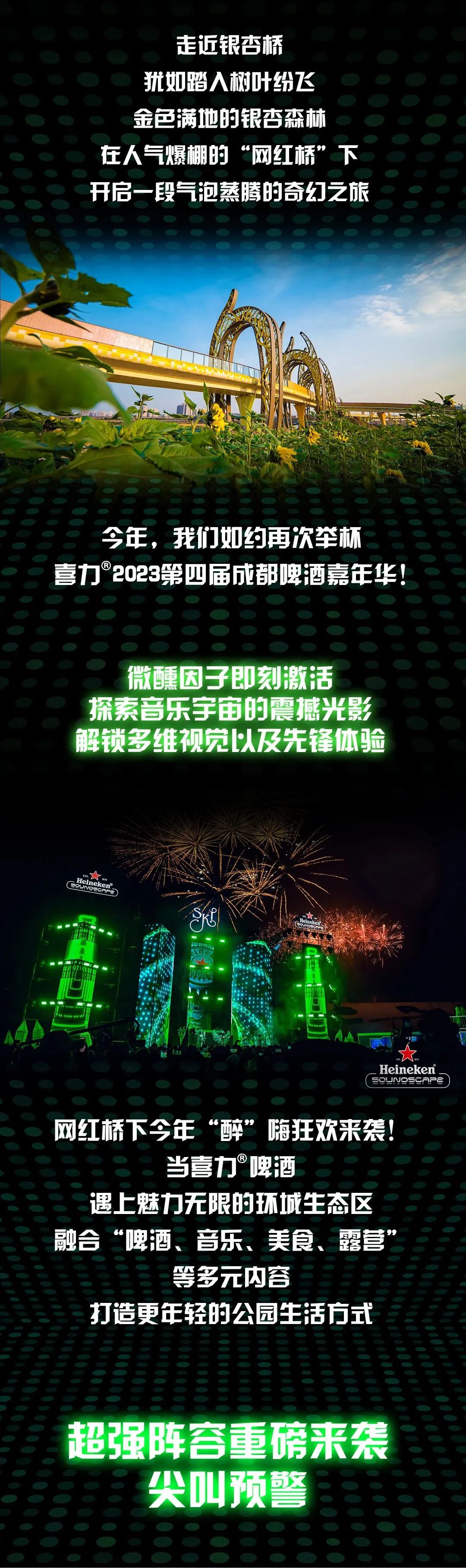 2023年天府绿道将携手喜力共造畅饮季,玩转音乐派对。说唱明星、摇滚天团、潮流DJ等轮番上阵,连嗨4天!更酷更潮更先锋的啤酒嘉年华,即将来袭!