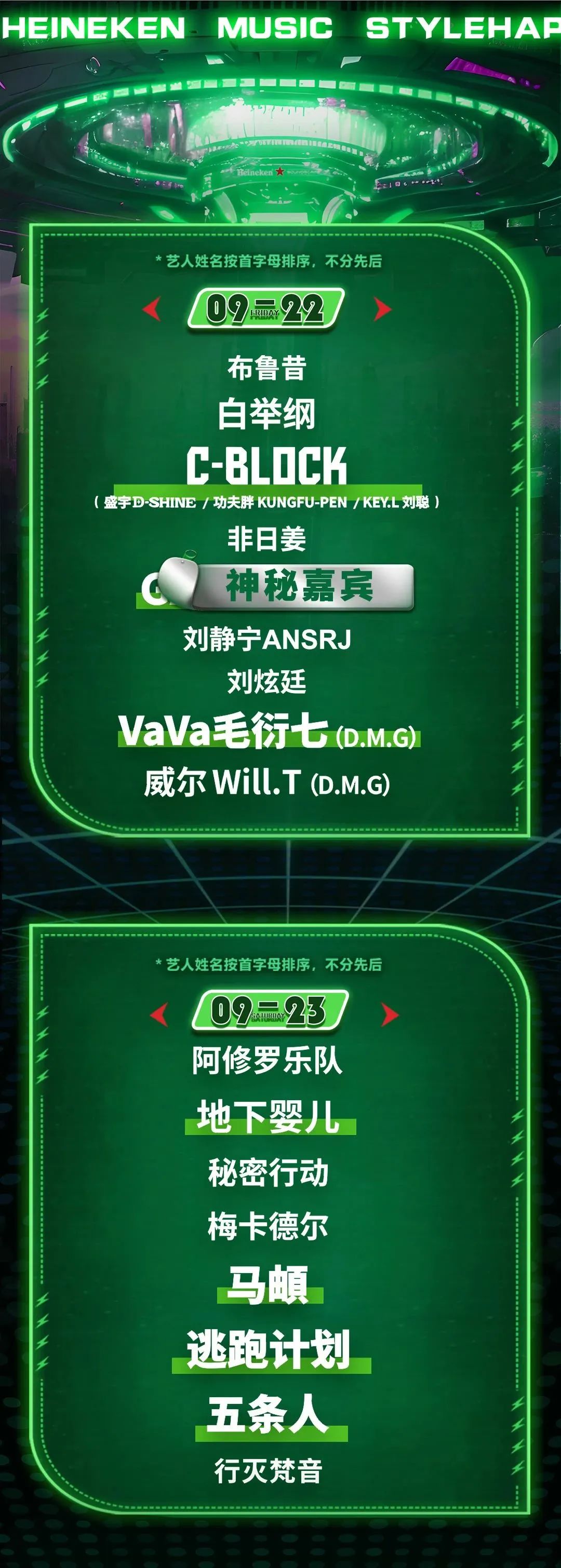 9月22日是精彩说唱之夜,现场邀请到白举纲、C-BLOCK(盛宇D-SHINE、功夫胖KUNGFU-PEN、KEY.L刘聪)、刘静宁ANSRJ、VaVa毛衍七(D.M.G)、威尔Will.T(DMG)等人气歌手,届时还有主题派对,不仅嗨的过瘾,玩的花样很多,还有神秘嘉宾等你一探究竟!