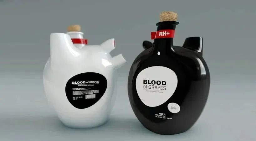 酒瓶以人的心脏为外观设计,颜色分黑白两款设计,瓶身贴有“BLOOD of GRAPES”的标签。酒瓶设计简约,使主题更加突出,极具艺术感。