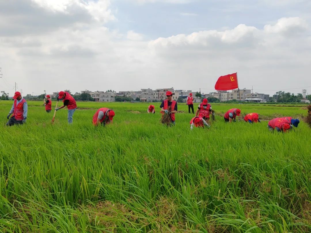 活动现场,一片绿油油的稻田迎来了一群“红马褂”,他们顶着酷暑,有序的投入到除草工作中。尽管阳光炽热、杂草众多,党员同志们仍然毫不退缩,同心协力,全身心投入,汗水浸湿衣服,但他们的干劲始终如一,凭借着顽强的毅力,坚持不懈,最终帮助种植户清除近10亩稻田的杂草。