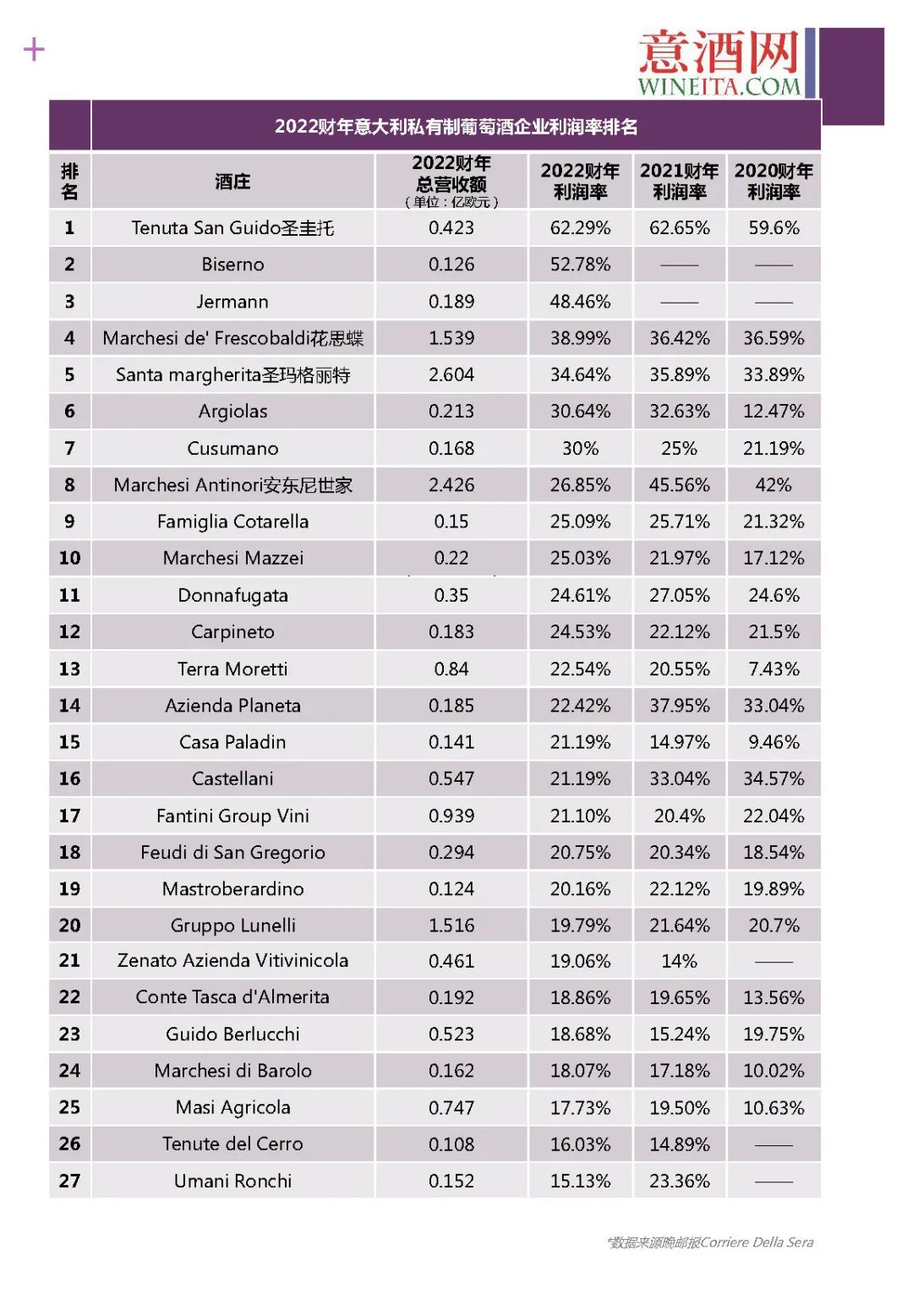 数据 | 意大利2022年度葡萄酒企业利润榜发布 西施嘉雅雄踞醉赚钱酒庄榜首