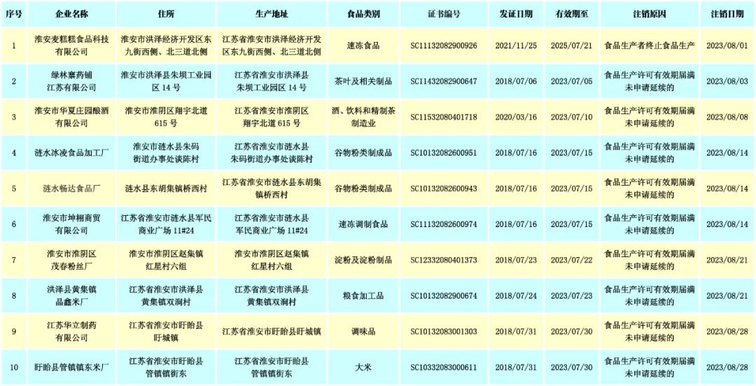 上述10家食品生产者被注销的证书和食品生产许可证编号停止使用。