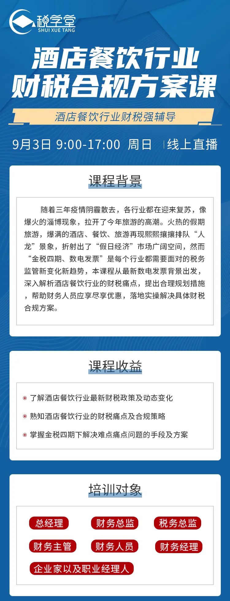 就在本周日9:00-17:00,税学堂特邀新三板集团财务总监董老师为大家带来酒店餐饮财税实操精讲课,学了就能用!