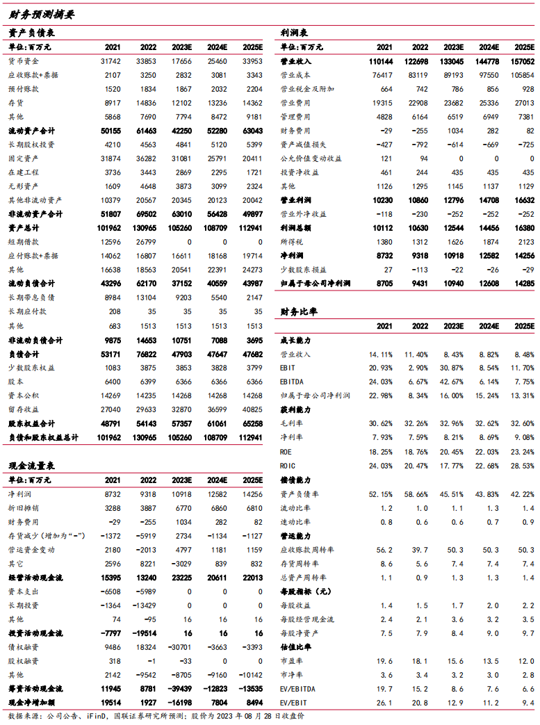 我们预计公司2023-2025年营业收入分别为 1330.45/ 1447.78/ 1570.52亿元(原值为 1355.81/ 1494.11/ 1600.93亿元),同比增速分别为 8.43%/ 8.82% / 8.48%,归母净利润分别为 109.40/ 126.08/ 142.85亿元(原值为 108.81/ 132.21/ 147.14亿元),同比增速分别为 16.00%/ 15.24%/ 13.31%,EPS分别为 1.72/ 1.98/ 2.24元/股,3年CAGR为14.81%。鉴于持续推进产品结构升级、渠道拓展增加营收,控制费用投入、增加使用效率提升利润率,参照可比公司估值,我们给予公司2023年20倍PE,目标价34元,维持 “买入”评级。