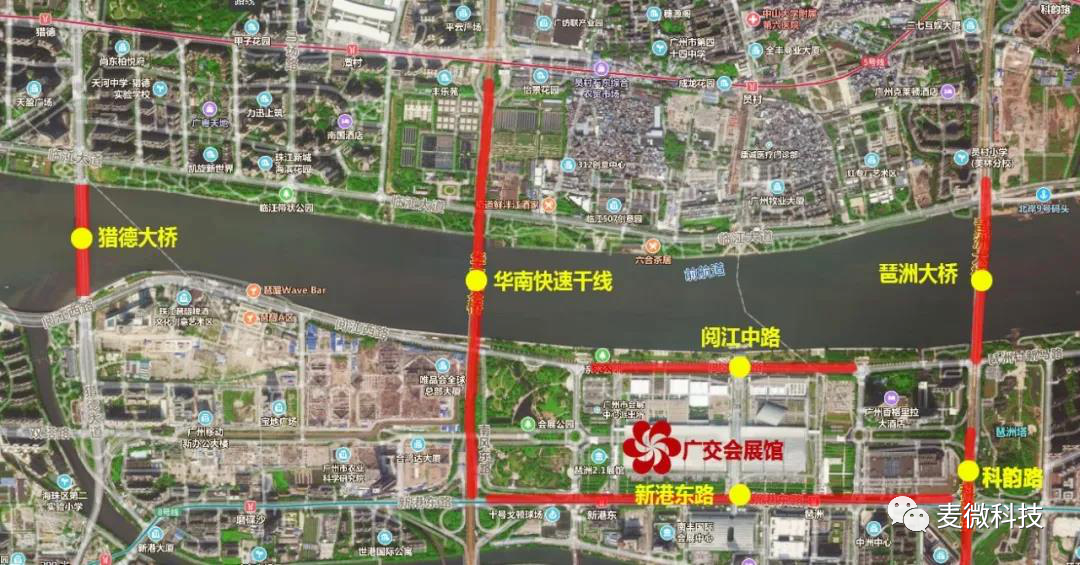 1.广交会展馆A区:定位广交会展馆-8号门,从阅江中路驶入,沿展场西路驶至斜坡处下地库;离场时由1.1馆负一层斜坡处驶出,16点前从6号门驶离,16点后从5号门驶离。