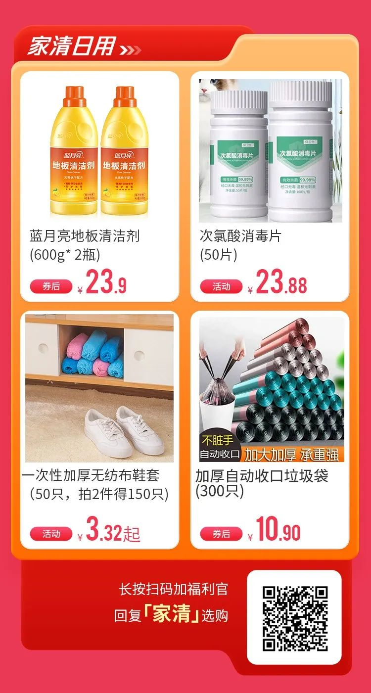 当然,年前也到了一年一度大扫除的时候~顺手的清洁神器很重要,来惠买年货节,价格比超市划算不少呢,赶紧冲!蓝月亮这个地板清洁剂便宜大碗又好用~除菌去污能力强 ,用它拖一遍地就行,不用再用清水擦哦,省时又省力!还有特殊时期少不了的次氯酸消毒片,无毒无刺激,宝宝的东西也能用~小小一片≈500ml消毒液,囤货也不占地方~还有像过年用得多的鞋套,收口垃圾袋,质量也都杠杠的,白菜价入手!(温馨提示:部分区域可能因为疫情原因暂停发货或者一时没货,下单前可以先找群主或者商家咨询沟通下哦。)