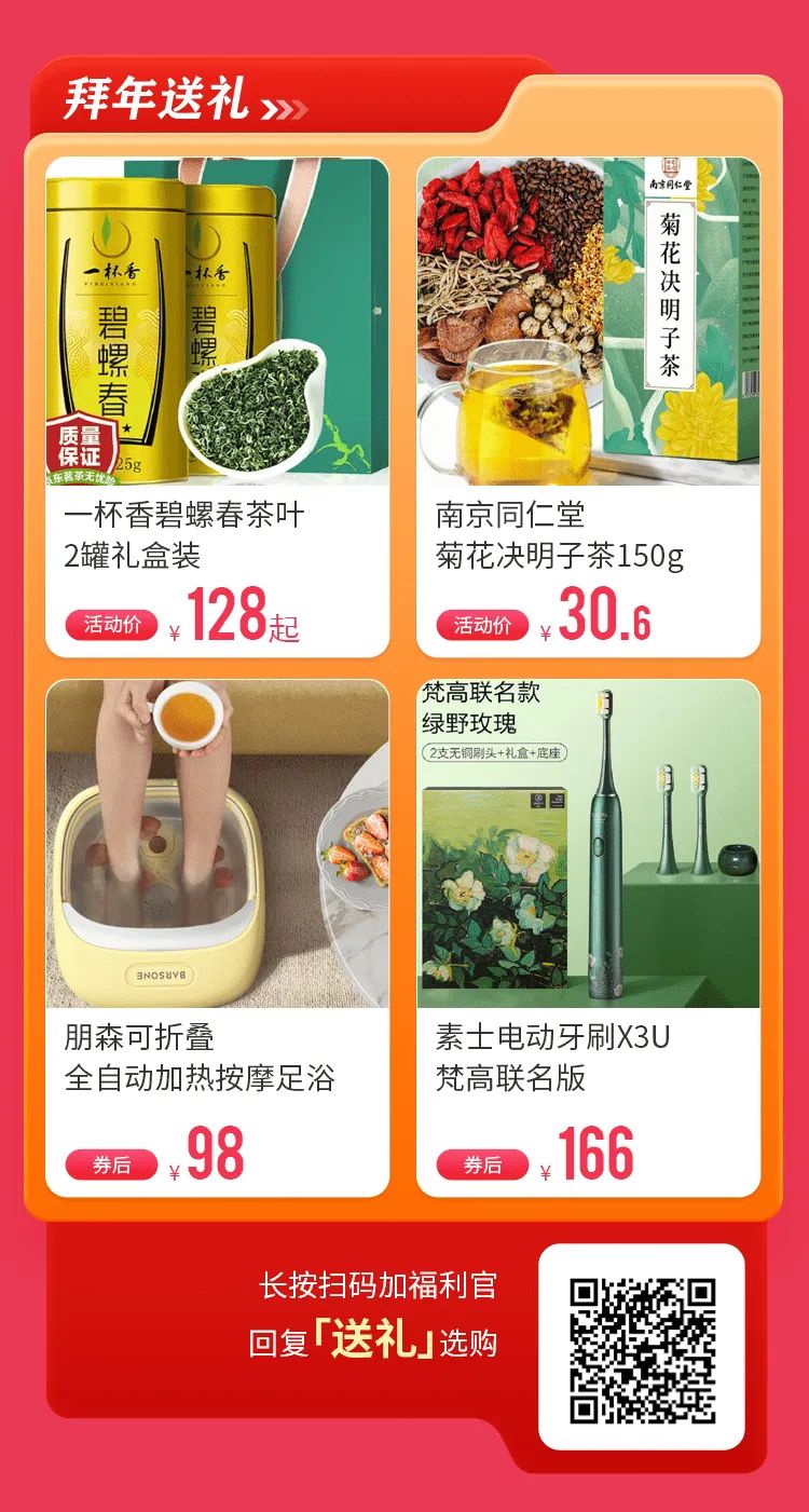 给长辈们拜年肯定不能空手,惠买年货节上的礼盒也是选择特别多!我帮大家先挑了几款~爱喝茶的就送这个苏州原产的碧螺春准没错~都是明前采摘的嫩芽,泡出来满屋茶香~还有南京同仁堂的菊花决明子茶,里面满满地道草本原料,非常适合爸爸妈妈这样的养生党~很多长辈不太重视口腔护理,牙龈又脆弱敏感,用这种电动牙刷既能清洁得更彻底,又没有刺激性~领完券166元一套,性价比真的高!泡脚桶就不用多说了,自动加热还带按摩功能,帮助改善血液循环,长辈们都喜欢~(温馨提示:部分区域可能因为疫情原因暂停发货或者一时没货,下单前可以先找群主或者商家咨询沟通下哦。)蓝月亮地板清洁剂600g*2瓶