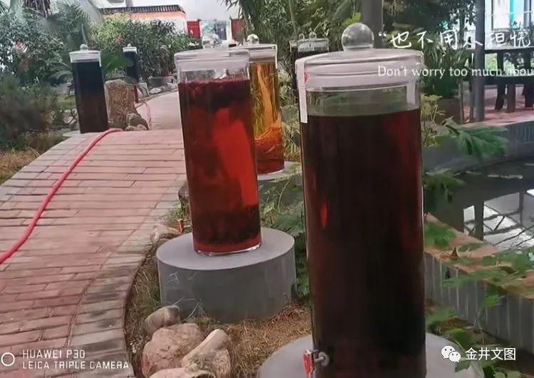 听着主人介绍,方知大略。其人约摸40岁年纪,体态魁梧,待人诚朴,有谦谦平和话,无高声狂狼语;原籍青岛即墨,来淄博创业,资本积累有余,开始进军酒业;特聘四川泸州酿酒师,携祖传配方、手艺,定位纯粮养生酒,创立万福酒业;固态发酵,古法酿造,粮食不碎而蒸馏,只取头道酒;短短三载有余,已然蜚声业内;销售主打定制定存,口碑佳供不应求。世人常谓,白酒多窖藏、洞藏、低温储藏;万福酒独辟蹊径,自然存放。其藏处,陈列室、大棚里、果园中、步道边,处处美酒;其器也,或缸,或瓮,或柱,或坛,或瓶,或罐,形态各异;其色也,或棕,或黄,或橙,或红,或黑,或褐,或深或浅,五色十光。吸天地之精华,承日月之华光,和光同尘,自然天成。