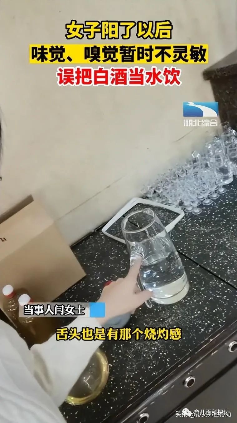 然后倒了满满一茶杯,一口闷了下去。虽然感觉不到味道,但是舌根传来的刺激感,让她感觉不太对劲。随后问了家人才知道,原来是家人将两瓶白酒倒进了分酒器里面,