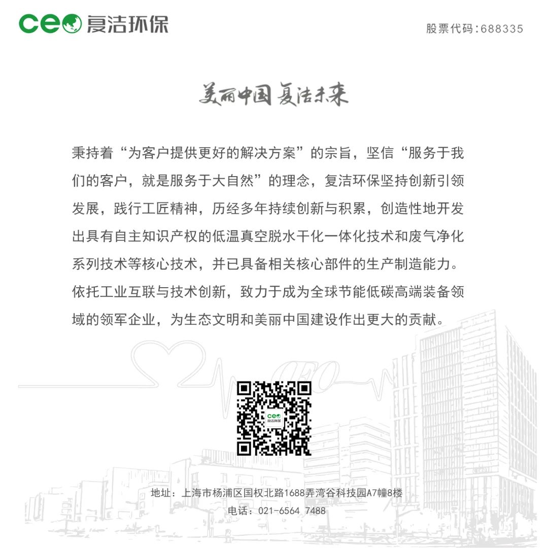 上海复洁环保科技股份有限公司是一家专注于污泥等物料脱水干化与固液分离、恶臭及挥发性有机废气净化、节能降碳综合服务的高科技企业。2020年8月,公司成为中国首家以污泥处理为主营业务的科创板上市企业(股票代码:688335.SH)。公司的发展以“创新”为根本,愿景是成为全球节能低碳高端装备领域的领军企业。