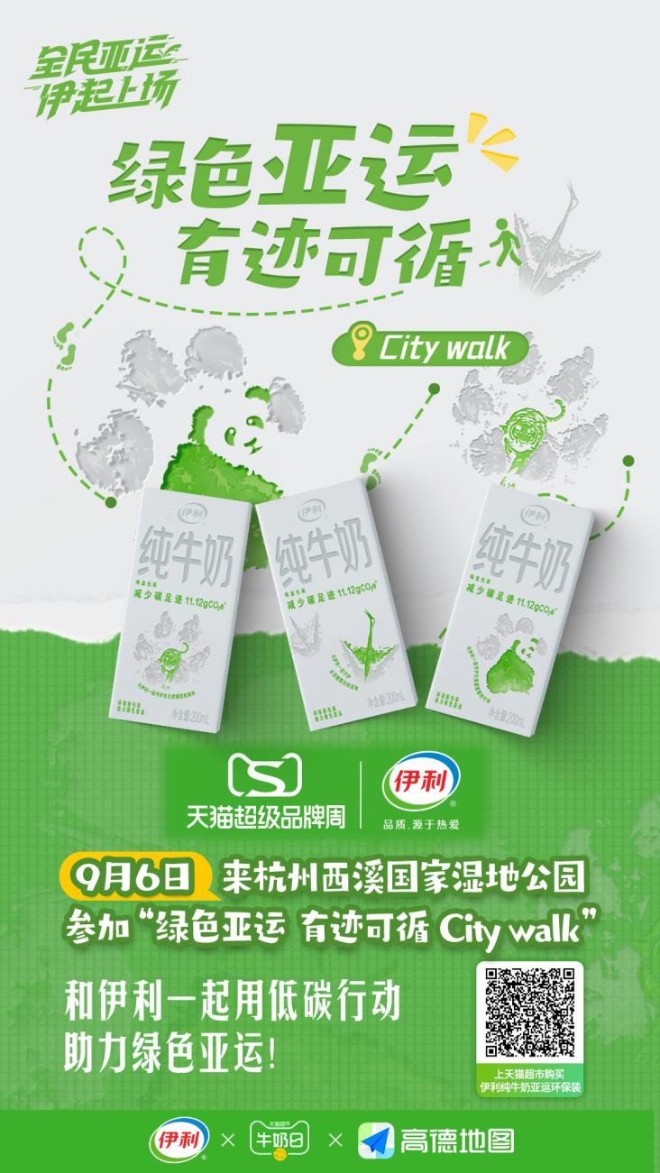 相较于金典对“有机”的坚守,伊利则是一如既往的坚持绿色低碳可持续发展的理念,以#环保同行 低碳亚运#为主题在天猫超品周首发上市伊利环保装,并联动高德绿色出行聚焦杭州,打造城市低碳足迹citywalk公益事件。除线下外,9月6日,伊利品牌代言人武磊还将做客伊利线上直播间,趣味运动互动,解密亚运环保装,营造亚运火热氛围。线下助力绿色亚运,线上烘托亚运氛围,整合线上线下资源链路,多措并举迎亚运。