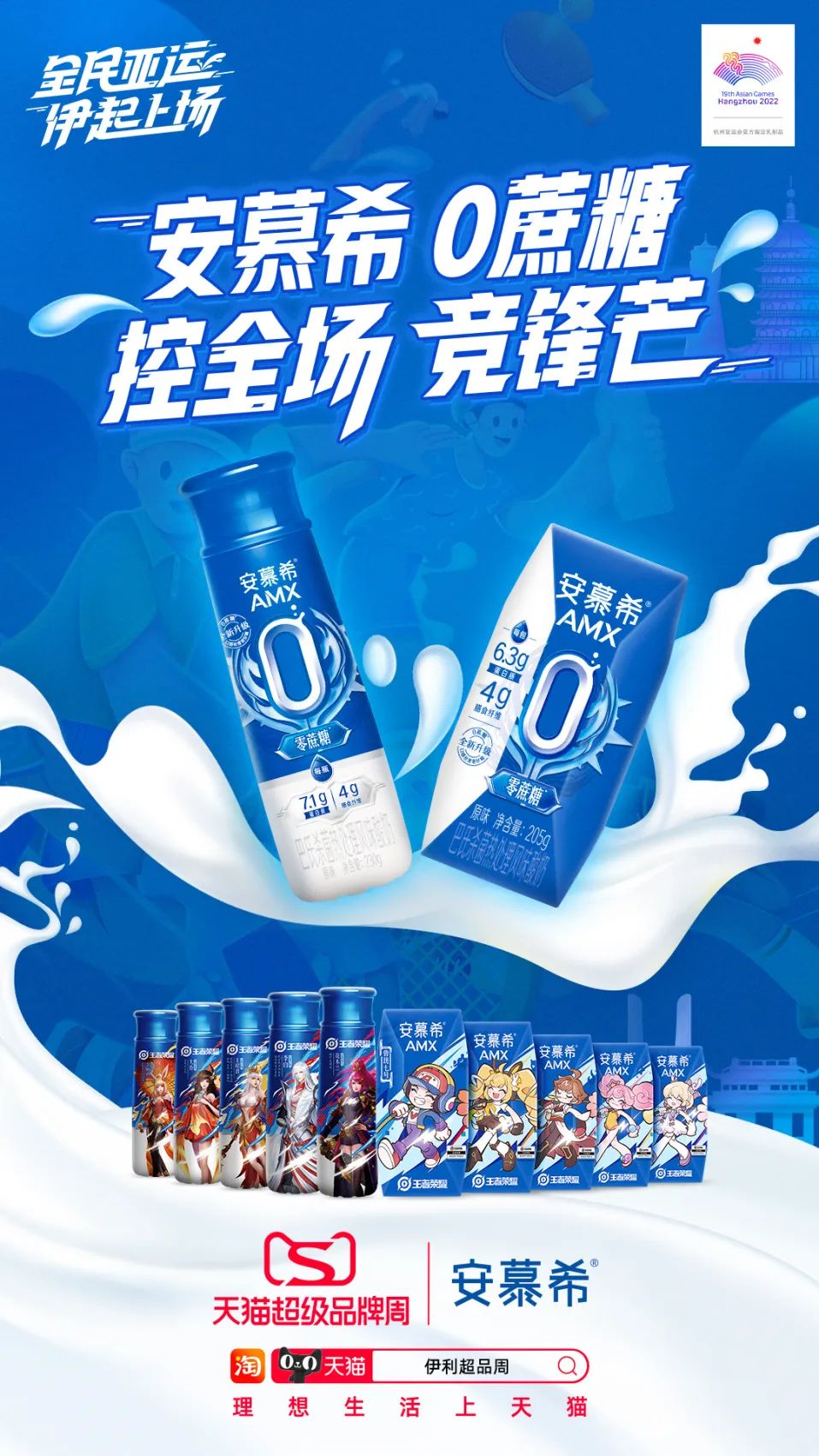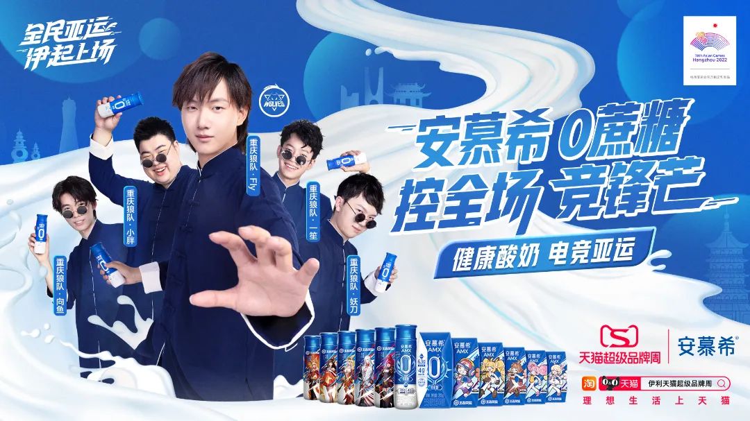 为此,在亚运会的这场青春浪潮中,自带年轻潮流青春活力基因的安慕希将亚运的青春色彩与品牌自身的热血属性相结合,以#安慕希 0蔗糖 控全场 竞锋芒#为主题,将于9月5日在线上安慕希旗舰店上演一场规模最大(八所高校联动)、时间最长(早8到晚8)、福利最多(百万优惠放送)的狼队电竞校园直播,为中国队打call,也为亚运注入更多青春动能。