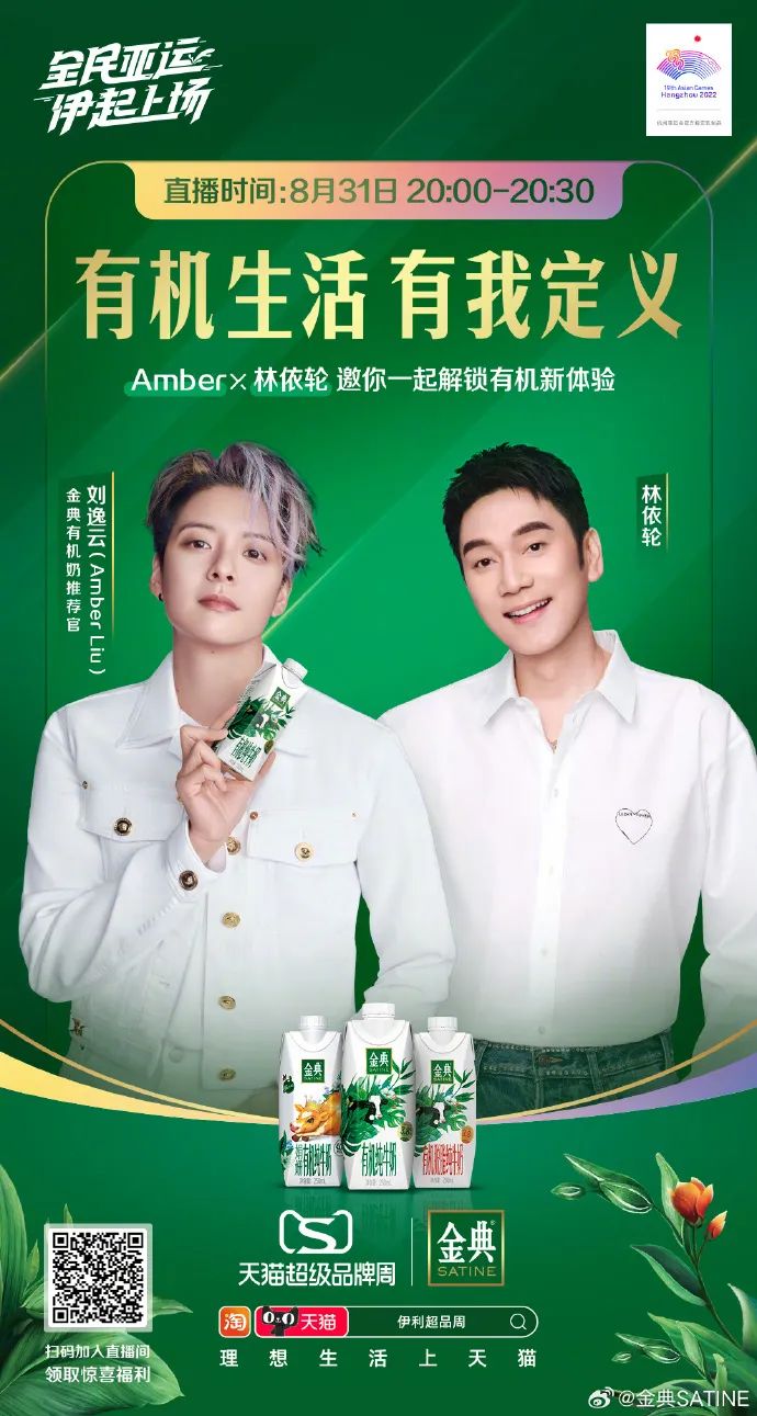就像此次参加伊利超品周的伊利、金典、安慕希、欣活等品牌在将亚运与品牌调性结合之后进行的主题规划一样。引领全民有机新时代的金典依旧紧扣“有机”理念,在#有机生活 有我定义#的活动主题下,8月31日,金典有机奶推荐官刘逸云Amber携手林依轮通过直播造势为超品周活动预热引流,前置宣发活动信息,金典的国民度+刘逸云Amber、林依轮的高人气让整场直播全程高能,人气火热。这也为9月4日金典“亚运杭城骑青桔”的活动打下良好的预热效果,届时,金典将在“绿色出行”这一核心点的指引下,呼吁全民践行有机低碳亚运行,一起有机生活,筑梦低碳时刻。