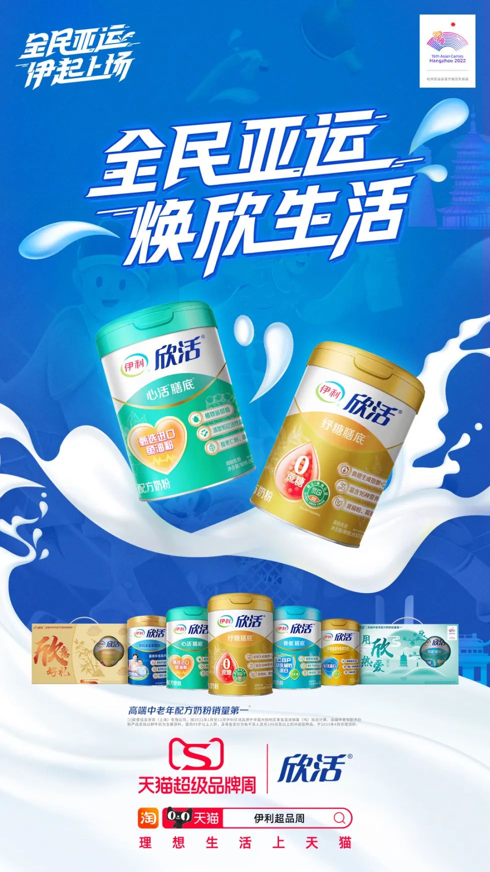 瞄准这一超级营销阵地之后,向来是走在行业潮流前沿的乳业巨头伊利再次展现出其前瞻性视野和敏锐的洞察力,与天猫进行共建占位,抢占行业营销制高点,打造“伊利天猫超级品牌周”活动,以“全民亚运 伊起上场”为主题,将以液态奶伊利、金典、安慕希等品牌及联动奶粉欣活品牌在9月3日至9月8日进行合力爆发,多款亚运定制装陆续登场,并在各大创意活动的加持下,拉动亚运营销声量及销量双丰收。