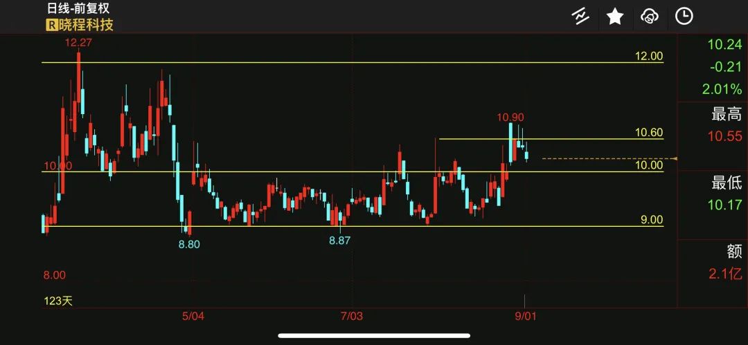 走势分析:9-10元箱体,在周一阴线震荡,大概率洗盘;周一低点附近,可试仓。