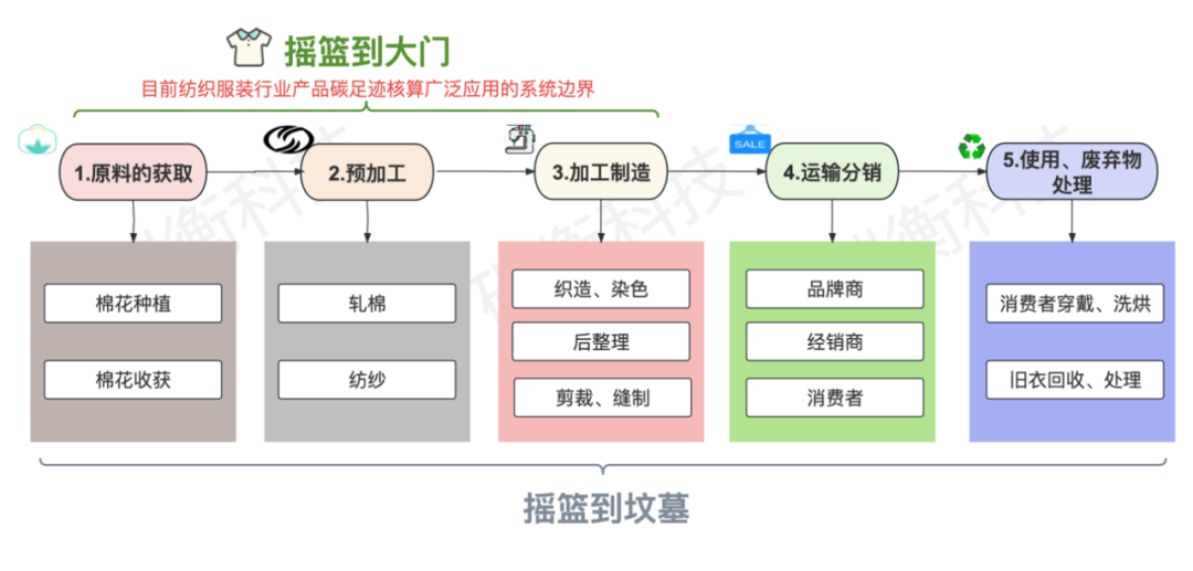 用一件新疆棉T-shirt的碳足迹举例,如果我们核算它从“摇篮到大门”的碳足迹,则需要核算原料获取、加工到制造完成阶段直接或间接产生的二氧化碳当量,这也是目前纺织服装行业产品碳足迹核算中广泛应用的核算方式;如果我们要核算它从“摇篮到坟墓”的碳足迹,则还需要将这件衣服运输分销、使用、废弃后处理阶段算进去,具体如下图所示。