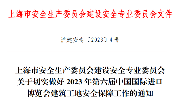 按照市委、市政府关于切实做好2023年第六届中国国际进口博览会(以下简称“进博会”)有关工作的总体部署和相关要求,市安全生产委员会建设安全专业委员会发布《关于切实做好2023年第六届中国国际进口博览会建筑工地安全保障工作的通知》。详见↓2023年是全面贯彻落实党的二十大精神的开局之年,是实施“十四五”规划承上启下的关键一年。举办中国国际进口博览会,是中国着眼于推动新一轮高水平对外开放作出的重大决策,是中国主动向世界开放市场的重大举措。各部门、各单位要切实提高政治站位,坚持底线思维,增强忧患意识,筑牢安全防线,以自身工作的确定性有效应对环境的不确定性,为进博会各项活动安全顺利召开营造更加良好的环境。(一)强化重点区域安全监管。要严格落实参建单位主体责任,持续开展重大事故隐患排查整治,做好危大工程管控,严厉打击违法违规行为,夯实安全生产基础,提升施工现场人防物防技防水平,坚决遏制各类生产安全事故发生。要建立进博会重点区域内在建工程基础台帐,做到“两个100%”,即安全检查100%覆盖,闭环整改100%。要做好重点区域内在建工地使用危险化学品的排查登记工作,切实管控好施工现场的危险化学品。10月1日前,排查重点区域内在建工地内使用液化气罐的情况,一旦发现应责令立即停止使用,并清退出场。要严格落实工地现场各项消防安全措施,确保不发生火灾事故,禁止一级施工动火,二级和三级动火作业要向上提升一级实施管理。对于因故停止施工的工地要明确责任单位,确保每一个工地都纳入管控范围。(二)强化现场文明施工措施。各参建单位要严格落实现场各项文明施工措施要求,规范建筑渣土启运、强化运输过程管理,确保承运车辆清洁、密闭,严禁抛洒滴漏。要严格执行现场洒水制度和落实裸土覆盖措施,减少扬尘污染。一旦启动空气重污染预警,要按照有关应急预案和临时管控要求采取相应紧急措施。要确保展会期间重点区域在建工地出入口两侧200米范围内无施工行为造成的污染、无堆物及影响市容市貌的现象。凡外观可视立面必须整洁美观,在用密目网要按照有关标准铺满,同时保持网体整洁,老旧破损密目网要及时更换。(三)强化施工现场分类管控措施。各参建单位要根据管控区域内在建工程的施工进度,对不同阶段的工程提出阶段性重点保障要求,密切关注现场基坑工程、各类危大工程及周边存在各类管线开挖工程的施工情况,主体结构工程外立面密目网、脚手架等安全设施的整体形象,装饰装修工程围墙及进出大门的设置及人员管控情况。(四)强化施工现场各项保障措施。要加强进博会安全保障措施的督查检查,督查各参建单位落实各项保障措施,做好各类矛盾化解。各参建单位要加强现场工作人员管理,明确现场人员总体职责,认真落实关键岗位人员到岗履职要求,展会期间项目经理等必须到岗履职。(一)各部门、各单位要进一步健全完善值班值守制度,保持通信畅通,展会期间严格执行领导干部在岗带班和关键岗位人员24小时值班制度。(二)各级建设管理部门和专业工程管理部门应在进博会前对重点区域内的在建工地进行一次检查评估,重点检查工地主体结构安全、危大工程、围墙、大门、安全设施(脚手架、安全网)、文明施工、值班值守等实施情况,确保工地参加各方主体责任落地落实。(三)各工程项目部应安排专人做好大门值守,各级建设管理部门和专业工程管理部门要对接属地街镇做好对重点区域内的停工工地检查排摸工作,实行“一对一、点对点”管理,派专人到工地驻场管理,“管住大门管住人”。严禁停工工地内容留社会闲散人员居住和进出,全面开展排查,做好蹲点保障,确保进博会期间整体平稳有序。(四)各部门、各单位要切实提高生产安全事故快速处置能力,一旦发生事故,按规定迅速启动应急预案,及时、有序、科学地开展救援工作,最大限度降低事故损失和减少社会影响。要加强信息报送工作,遇有突发险情、灾情等要第一时间上报信息。转自:上海住房城乡建设管理