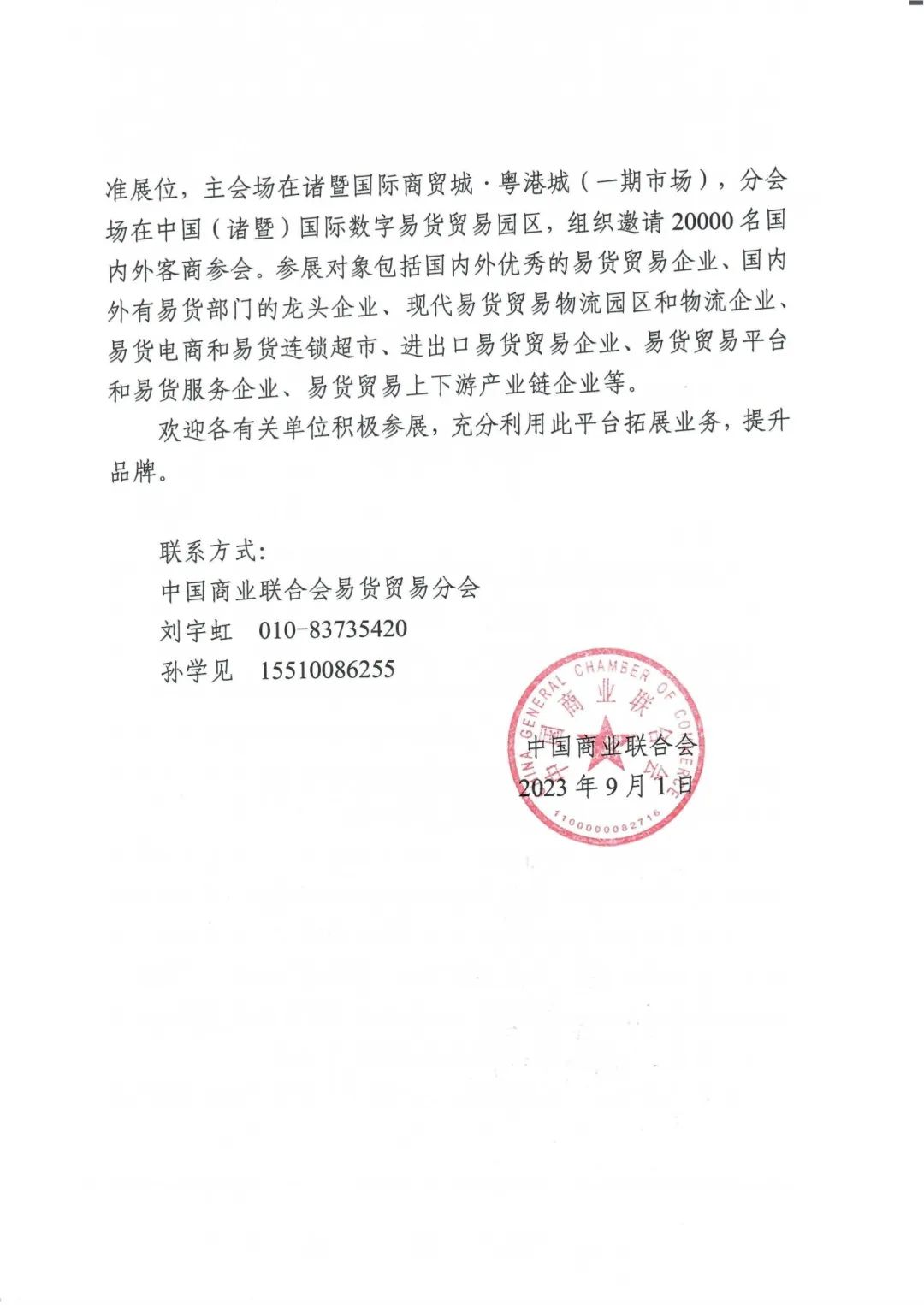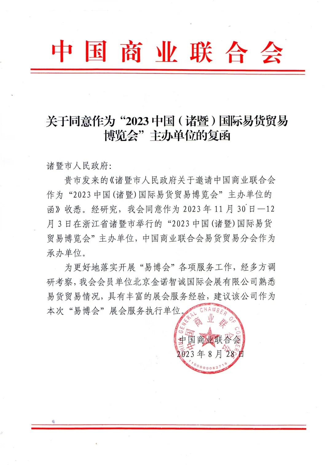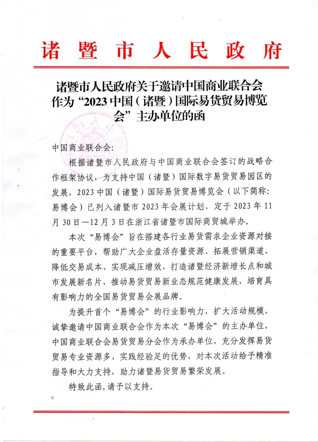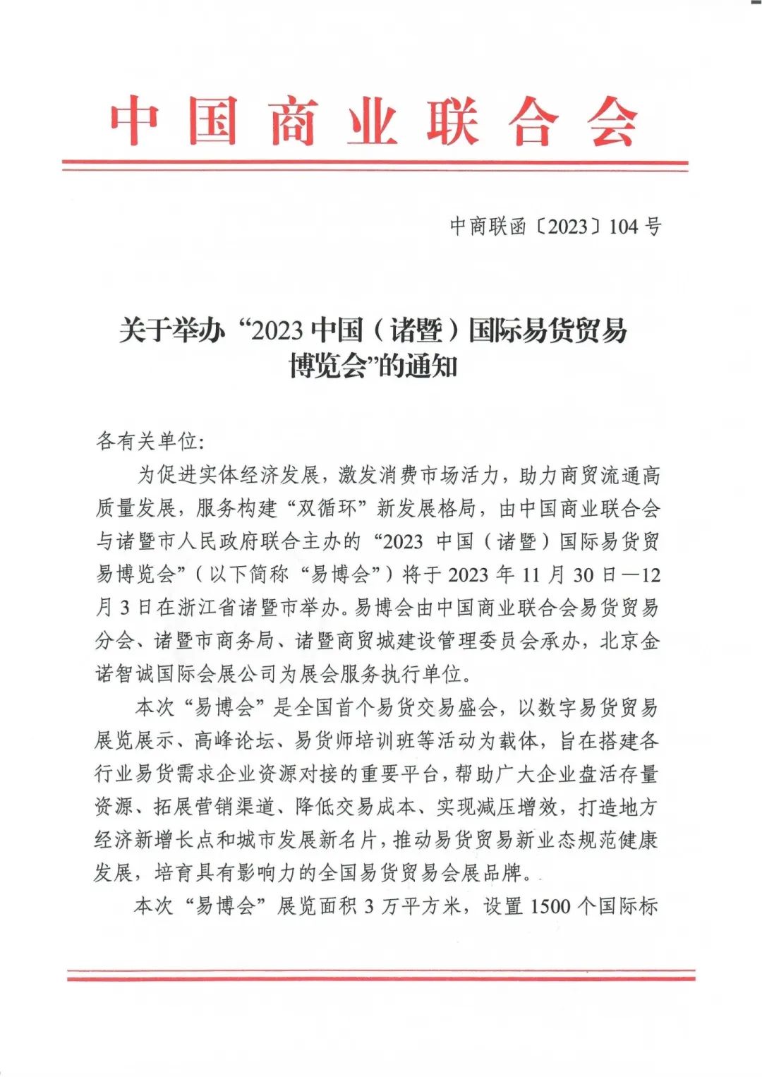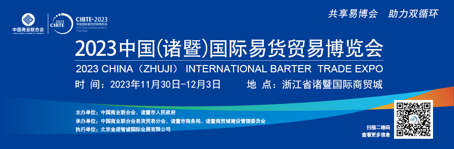 9月1日,中国商业联合会发布《关于举办2023中国(诸暨)国际易货贸易博览会的通知》。为促进实体经济发展,激发消费市场活力,助力商贸流通高质量发展,服务构建“双循环”新发展格局,由中国商业联合会与诸暨市人民政府联合主办的“2023中国(诸暨)国际易货贸易博览会”(以下简称“易博会”)将于2023年11月30日—12月3日在浙江省诸暨市举办。该展会由中国商业联合会易货贸易分会、诸暨市商务局、诸暨商贸城建设管理委员会承办,北京金诺智诚国际会展公司为展会服务执行单位。