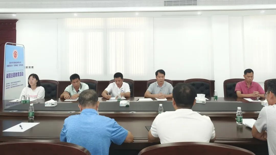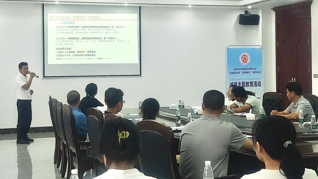 为积极倡导文明行为和诚信意识,提高大家对食品安全的关注度和参与度,培养正确健康的饮食习惯,传播诚信文明理念,弘扬诚信文化,助力创建茂名市创建国文明城市工作,8月30日上午,华晟食品公司在行政楼四楼会议室举办“诚信主题教育活动”。华晟食品公司董事长李振团及公司部分员工参加。电白区工商联党组成员、副主席谢春,二级主任科员张华,办公室主任何东荣,区司法局公律股股长、四级主任科员黎家源等应邀到场指导。本次活动由李振团董事长主持。
