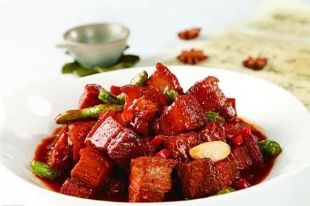 圆葱炒鸡蛋、红烧肉、金鱼馒头、绿豆小米粥