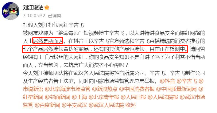 正当热血网友们义愤填膺地为辛吉飞站台,誓死捍卫他“食品安全斗士”第一人的地位时,充满戏剧性的反转剧情出现了。