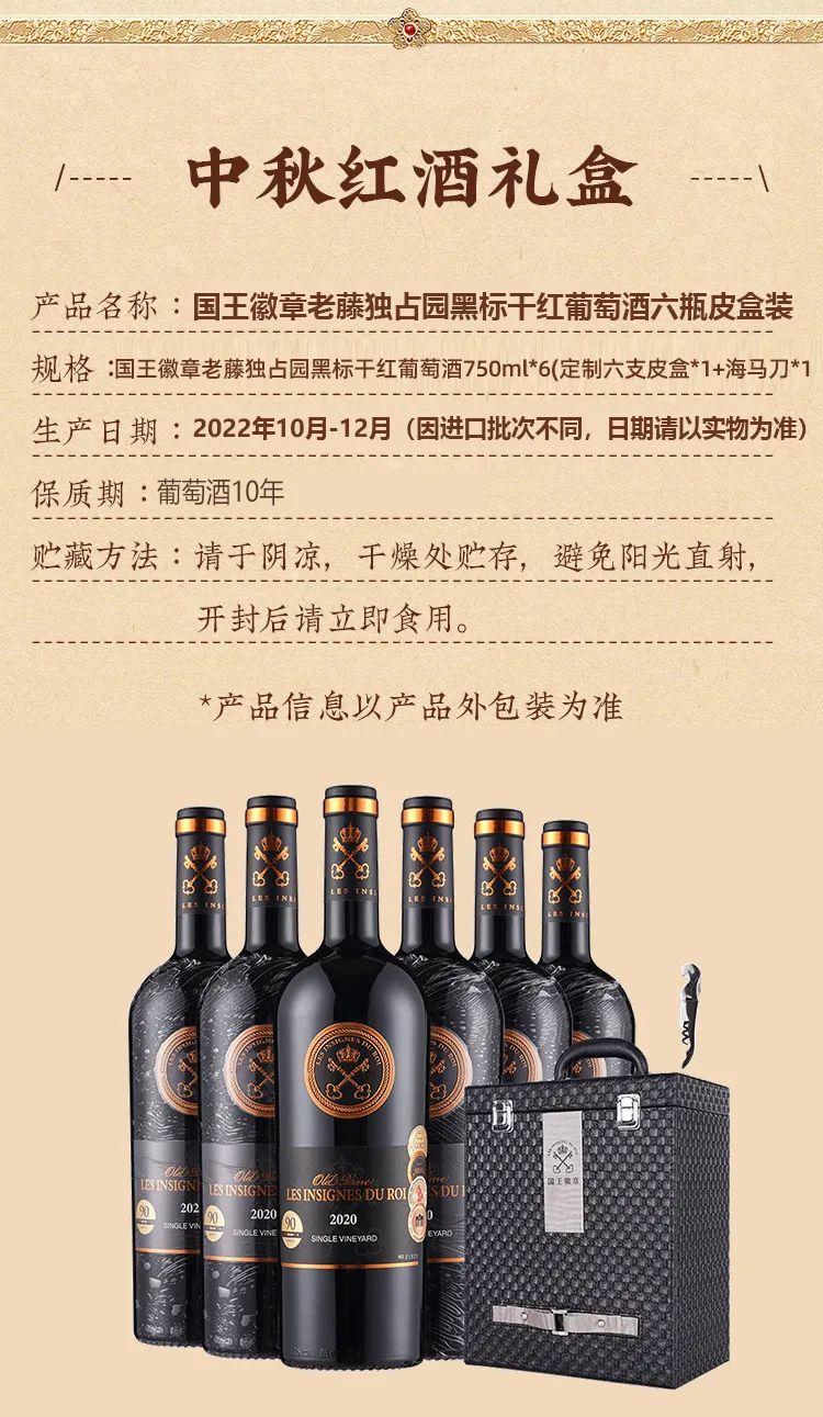 【规格】国王徽章老藤独占园黑标干红750ml*6+定制六支皮盒*1+海马刀*1
