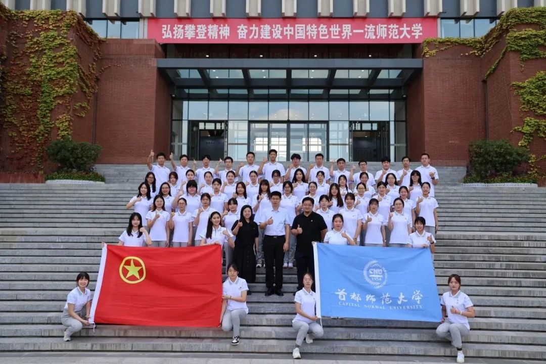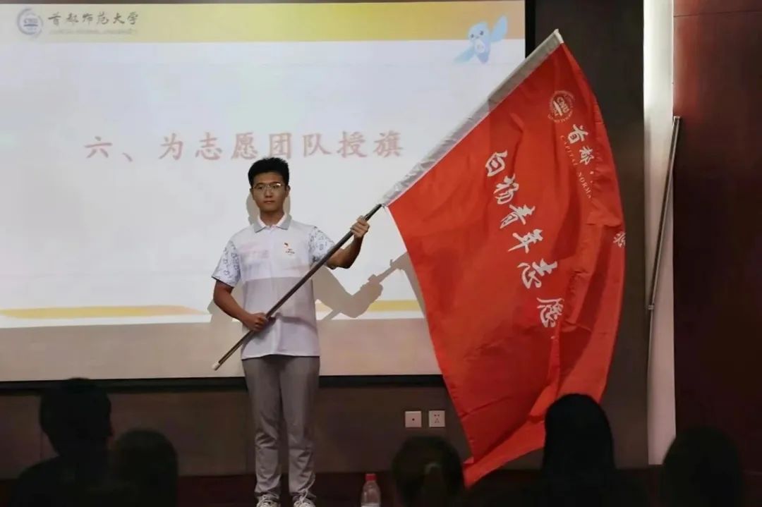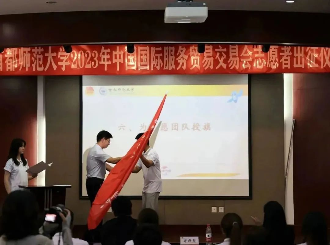 学生工作部(处)长兼武装部部长、校团委书记齐成龙为首都师范大学2023年服贸会志愿服务团授旗。