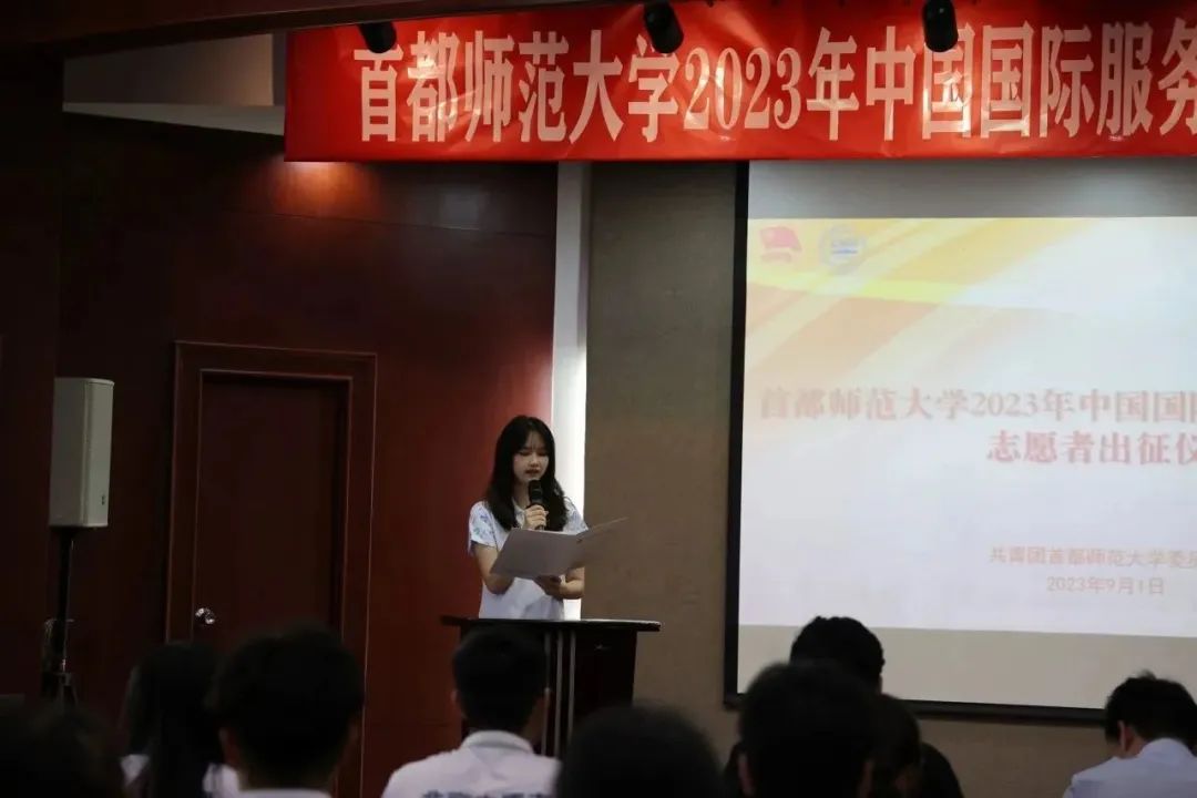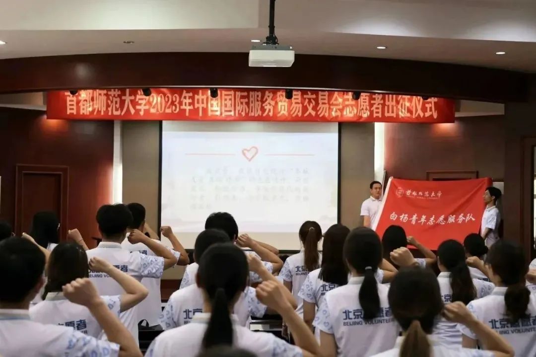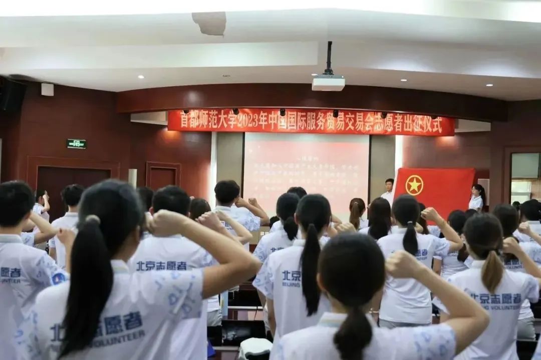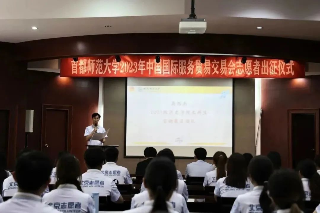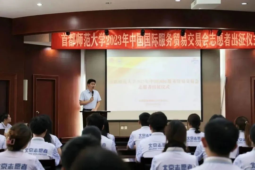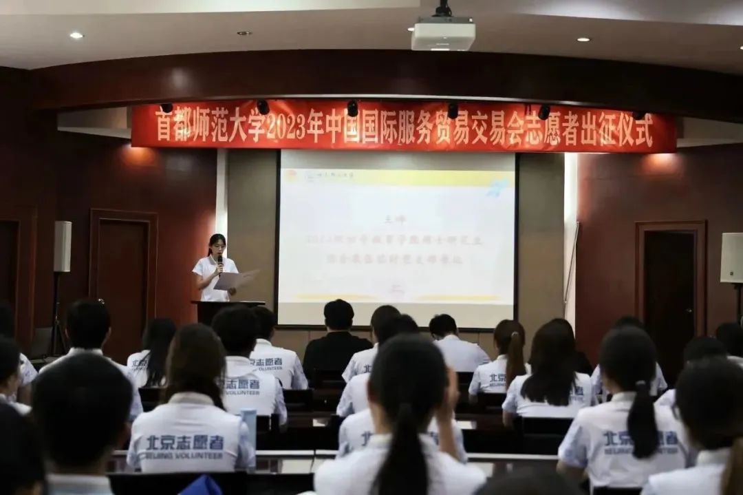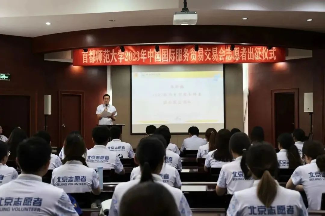 2023年9月1日下午,我校在校本部电教楼国际报告厅举行2023年中国国际服务贸易交易会(以下简称服贸会)志愿者出征仪式。学生工作部(处)长兼武装部部长、校团委书记齐成龙,校团委副书记毛佳鹏,校团委实践部部长陈越及全体志愿者参加会议。会议由校团委青协主席胡雪倩主持。