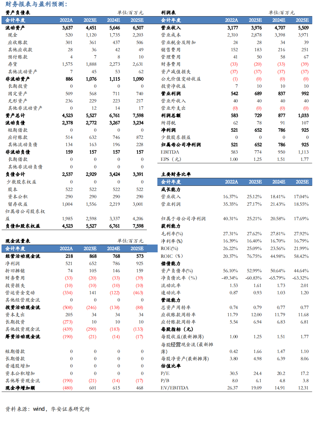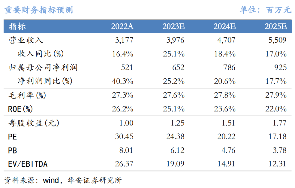 我们预测公司2023-2025年营业收入分别为40/47/55亿元,归母净利润分别为6.52/7.86/9.25亿元,以当前总股本5.22亿股计算的摊薄EPS为1.25/1.51/1.77元。公司当前股价对2023-2025年预测EPS的PE倍数分别为24/20/17倍。考虑公司在行业恢复期逆势提升,领先地位凸显,在国产替代加速背景下有望获得更多竞争优势,维持“买入”评级。