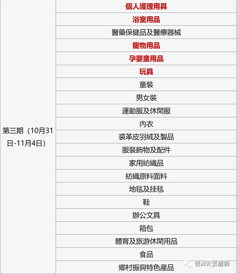 将玩具展区、孕婴童用品展区、宠物用品展区、个人护理用具展区、浴室用品展区从第二期调至第三期;