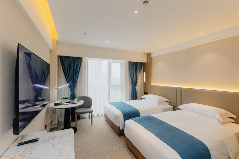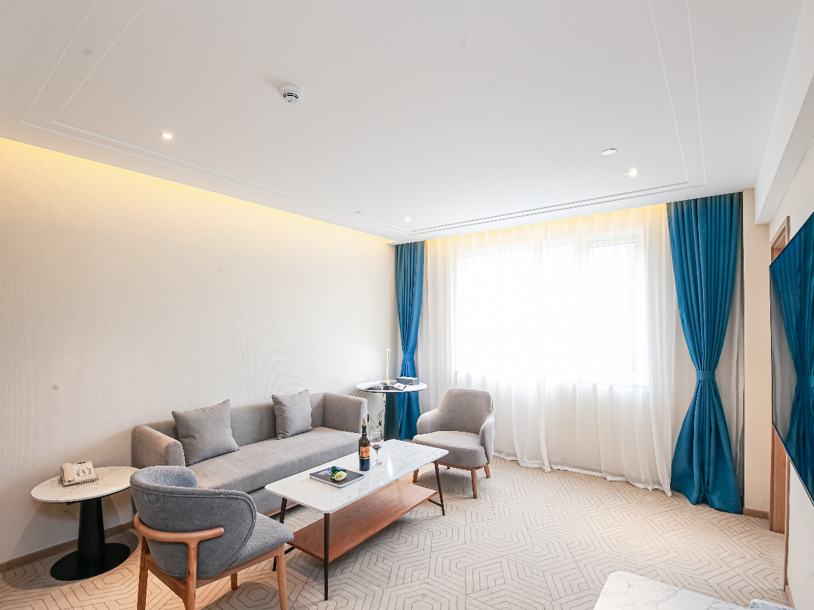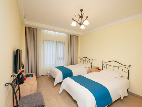 山景家庭套房。房间面积45平米,这间房是由一间大床房和一间双床房组成,非常适合家庭出游的客户需求,尤其是二孩家庭,可以让两个小朋友都有独立的睡眠空间,同时65寸的智能电视可投屏可上网,可以让小朋友尽情玩耍。