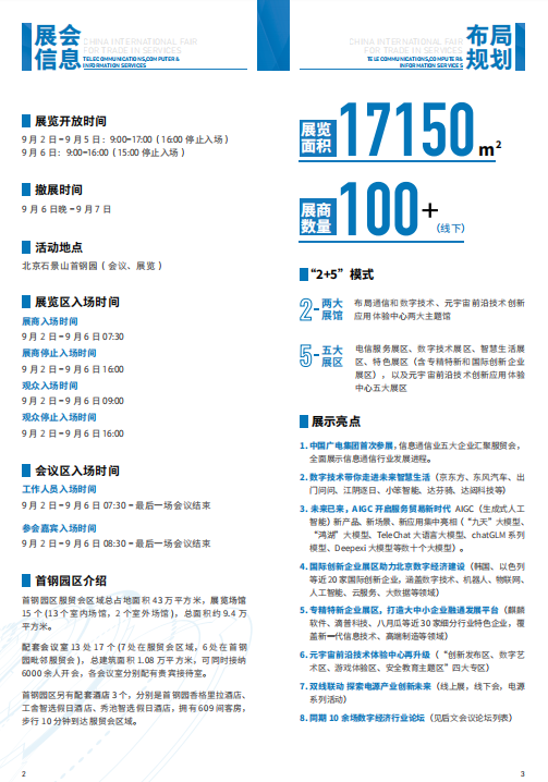 由商务部和北京市人民政府主办的2023年中国国际服务贸易交易会(以下简称:服贸会)将于9月2日至6日在国家会议中心和周边的国家体育馆以及首钢园区举办。作为服贸会的重要科技板块之一,电信、计算机和信息服务专题展(以下简称:服贸会ICT展)历来备受各界关注,已经成为国内外展示智慧通信建设成果和创新应用实践,提供数字技术贸易服务,传播电子智能新业态、新模式、新理念,服务全球数字经济发展的重要平台。
