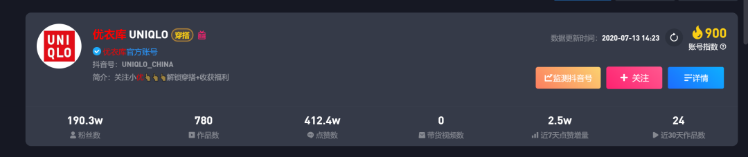 在这些靠前账号中,并没有知名服装品牌。比如大家熟悉的UNIQLO、海澜之家、ZARA等,粉丝最多的是优衣库,也才190万。