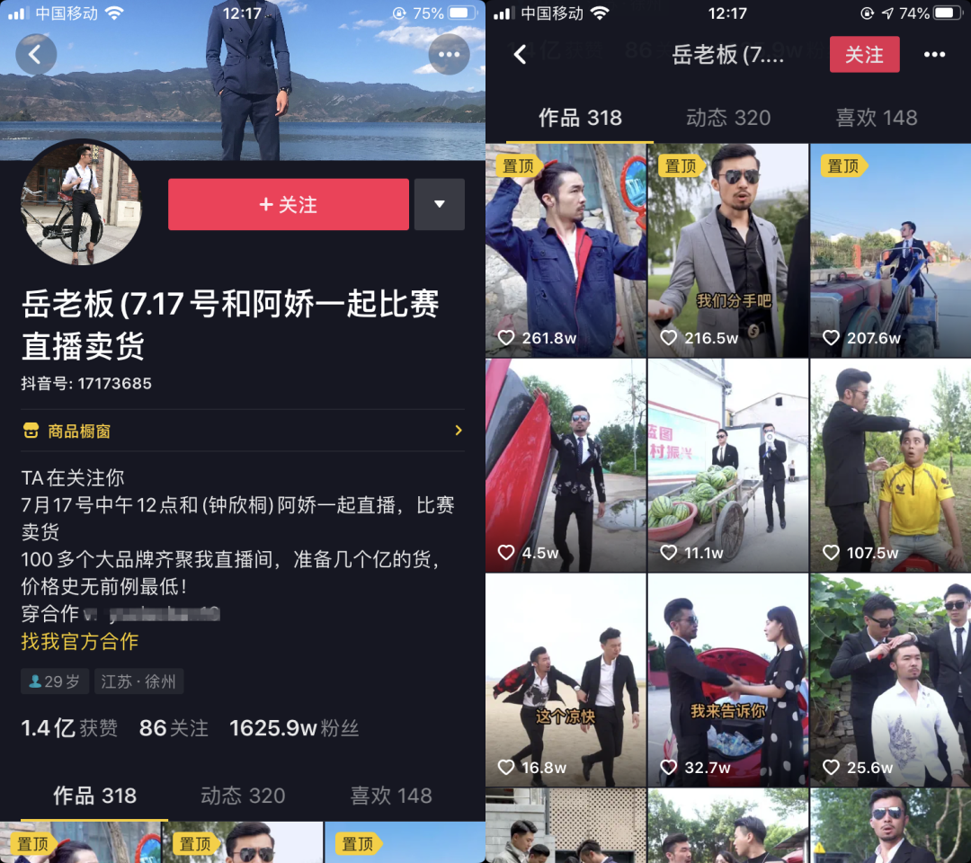 抖音拥有1600万粉丝的岳老板,经常一身正装开拖拉机、扮演各种搞笑的剧情,但其实他是卖西服的。